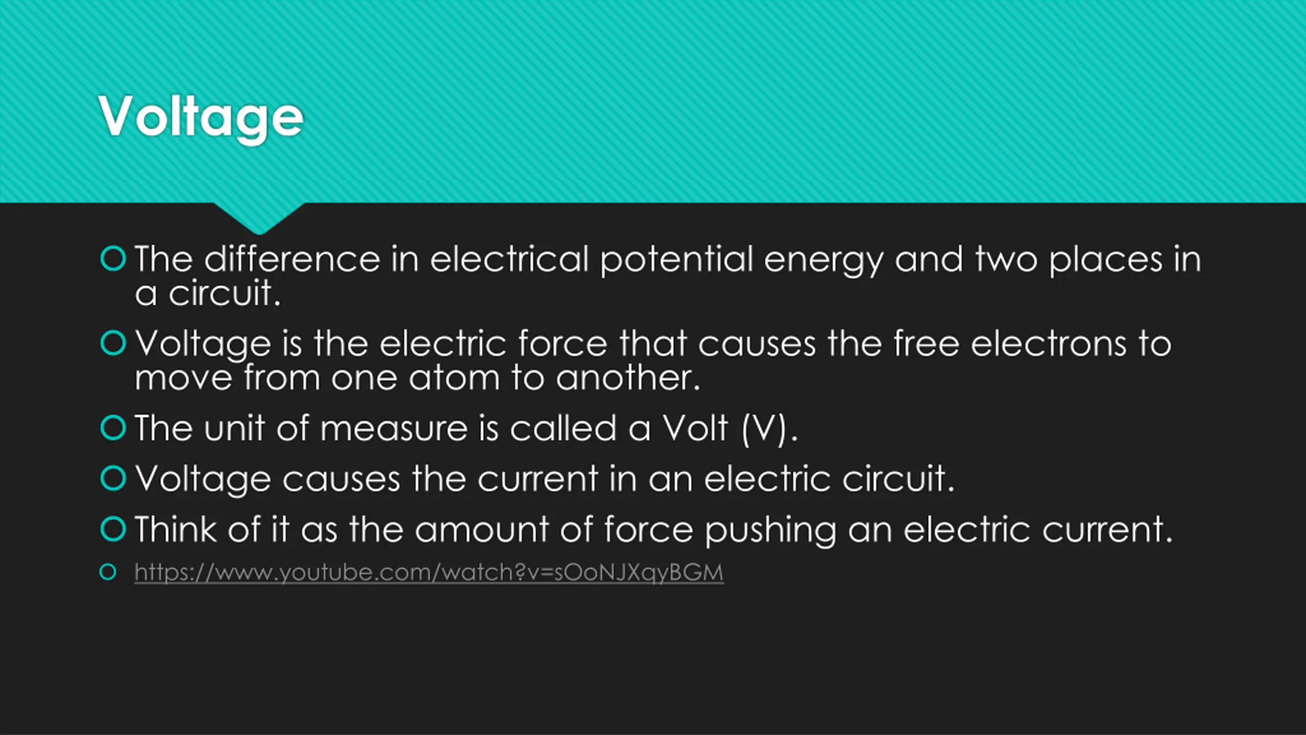 Voltage The difference in electrical potential energy and two places in a circuit. Voltage is the electric force that causes the free electrons to move from one atom to another. The unit of measure is called a Volt (V). Voltage causes the current in an electric circuit. Think of it as the amount of force pushing an electric current. https://www.youtube.com/watch?v=sOoNJXqyBGM
