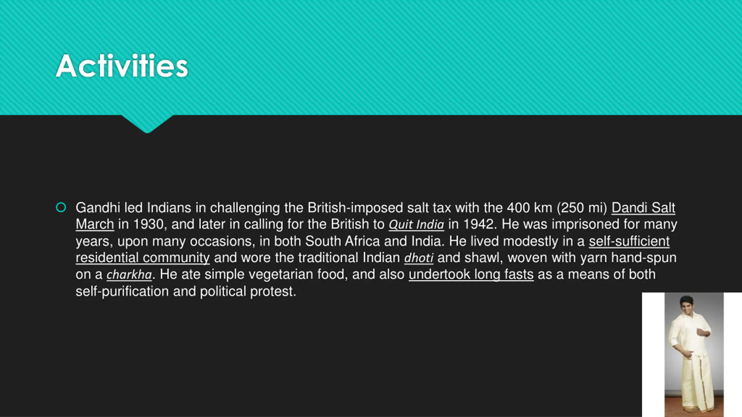 Activities Gandhi led Indians in challenging the British-imposed salt tax with the 400 km (250 mi) Dandi Salt March in 1930, and later in calling for the British to Quit India in 1942. He was imprisoned for many years, upon many occasions, in both South Africa and India. He lived modestly in a self-sufficient residential community and wore the traditional Indian dhoti and shawl, woven with yarn hand-spun on a charkha. He ate simple vegetarian food, and also undertook long fasts as a means of both self-purification and political protest.