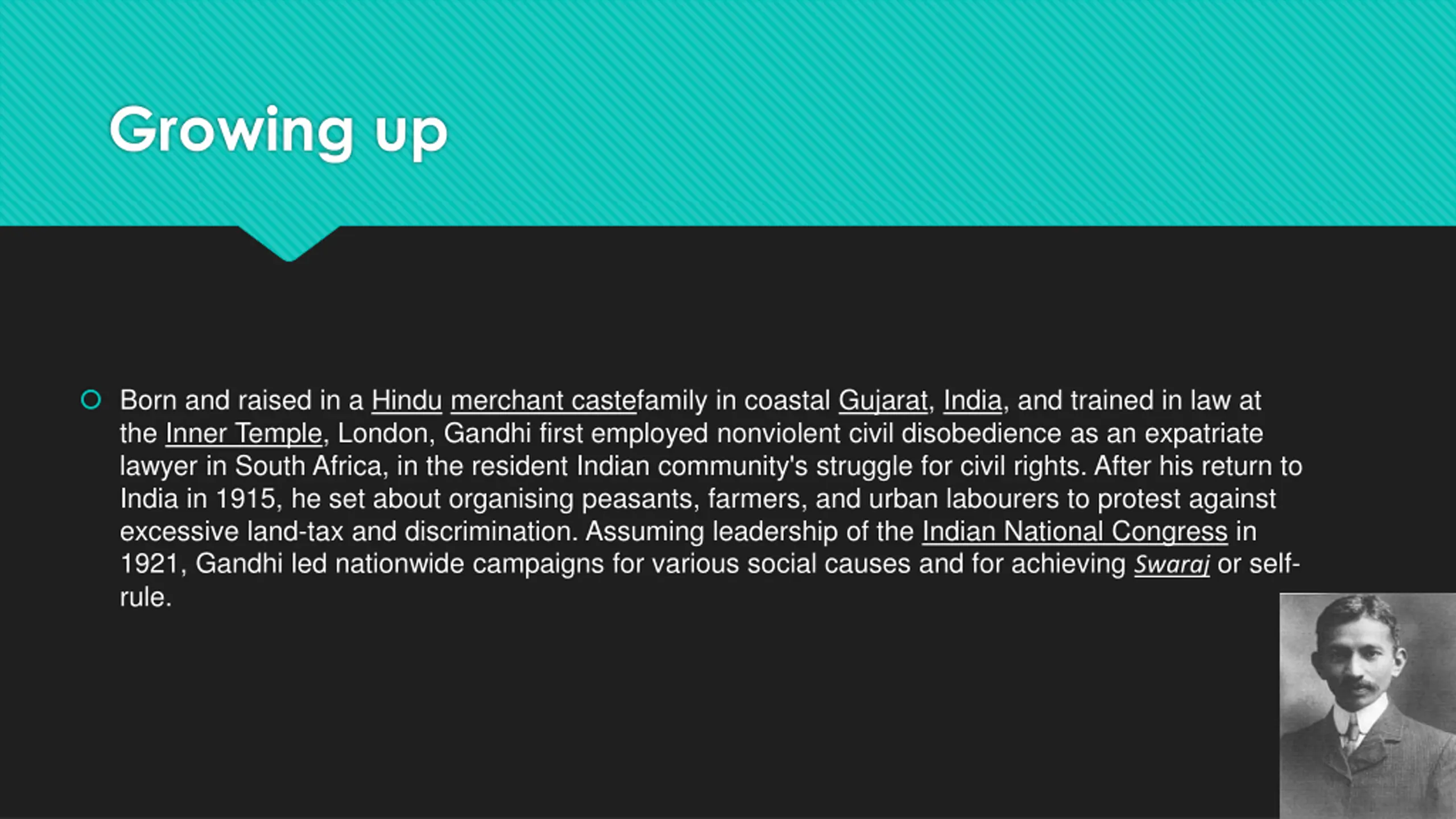 Growing up Born and raised in a Hindu merchant castefamily in coastal Gujarat, India, and trained in law at the Inner Temple, London, Gandhi first employed nonviolent civil disobedience as an expatriate lawyer in South Africa, in the resident Indian community's struggle for civil rights. After his return to India in 1915, he set about organising peasants, farmers, and urban labourers to protest against excessive land-tax and discrimination. Assuming leadership of the Indian National Congress in 1921, Gandhi led nationwide campaigns for various social causes and for achieving Swaraj or self- rule.