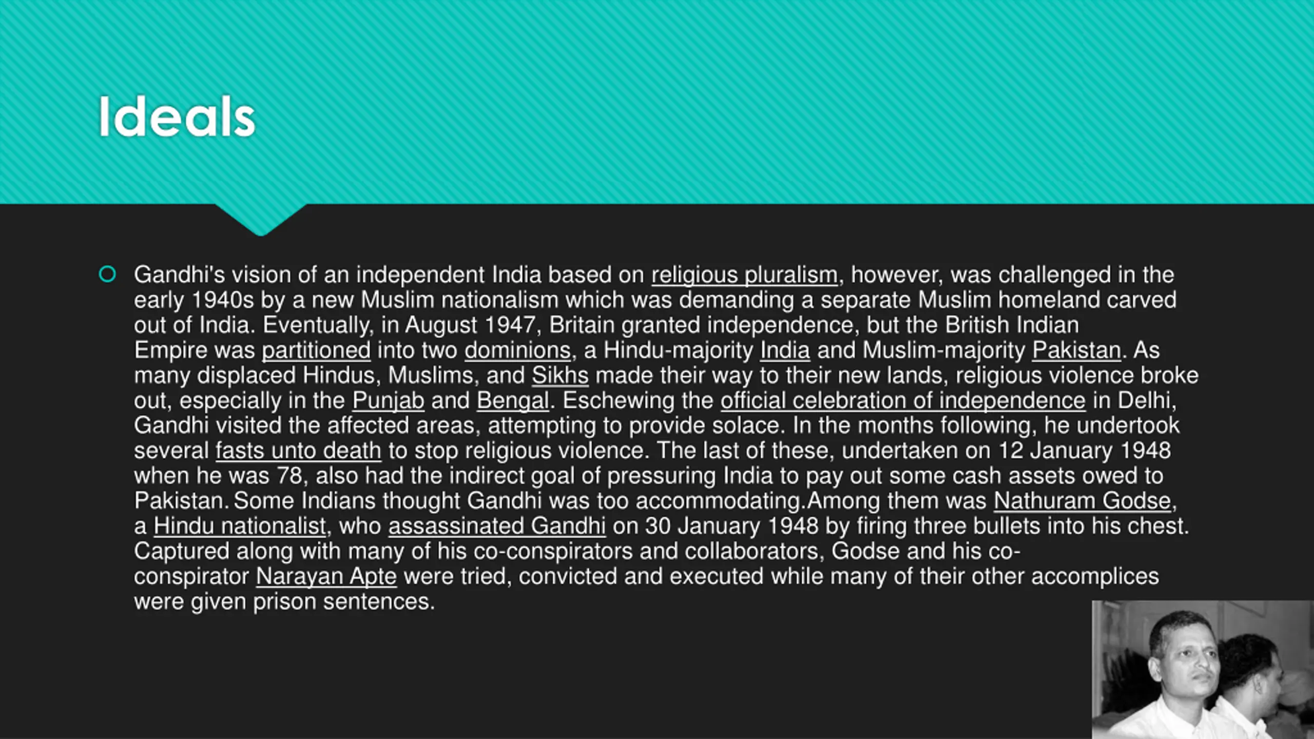 Ideals Gandhi's vision of an independent India based on religious pluralism, however, was challenged in the early 1940s by a new Muslim nationalism which was demanding a separate Muslim homeland carved out of India. Eventually, in August 1947, Britain granted independence, but the British Indian Empire was partitioned into two dominions, a Hindu-majority India and Muslim-majority Pakistan. As many displaced Hindus, Muslims, and Sikhs made their way to their new lands, religious violence broke out, especially in the Punjab and Bengal. Eschewing the official celebration of independence in Delhi, Gandhi visited the affected areas, attempting to provide solace. In the months following, he undertook several fasts unto death to stop religious violence. The last of these, undertaken on 12 January 1948 when he was 78, also had the indirect goal of pressuring India to pay out some cash assets owed to Pakistan.Some Indians thought Gandhi was too accommodating.Among them was Nathuram Godse, a Hindu nationalist, who assassinated Gandhi on 30 January 1948 by firing three bullets into his chest. Captured along with many of his co-conspirators and collaborators, Godse and his co- conspirator Narayan Apte were tried, convicted and executed while many of their other accomplices were given prison sentences.
