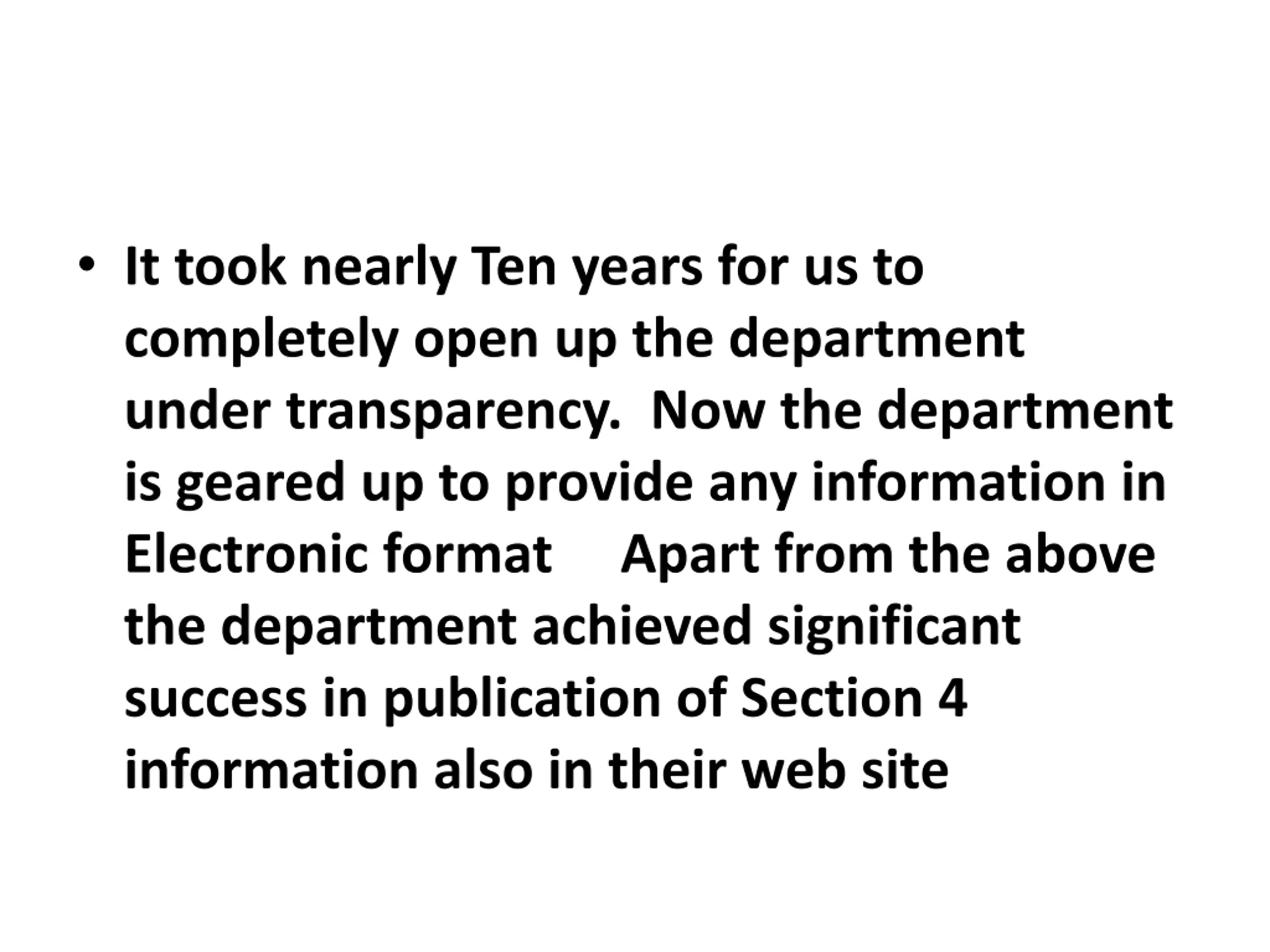 It took nearly Ten years for us to completely open up the department under transparency. Now the department is geared up to provide any information in Electronic format Apart from the above the department achieved significant success in publication of Section 4 information also in their web site