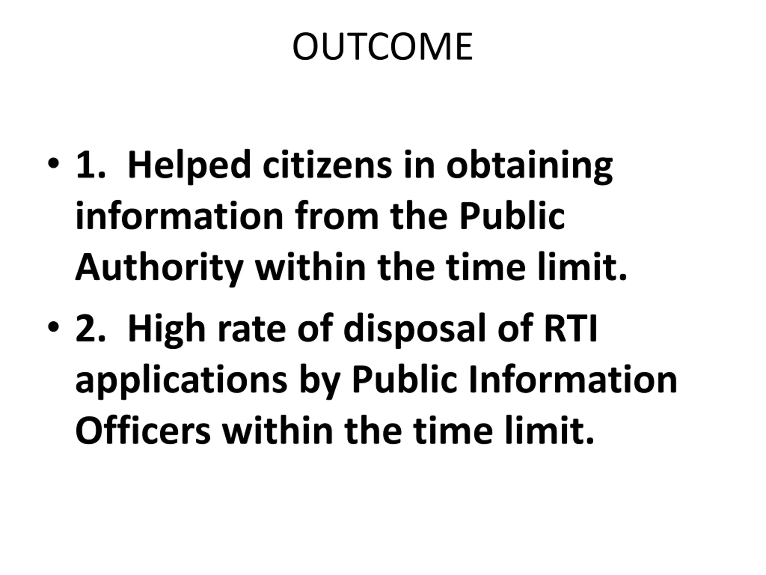 OUTCOME 1. Helped citizens in obtaining information from the Public Authority within the time limit. 2. High rate of disposal of RTI applications by Public Information Officers within the time limit.