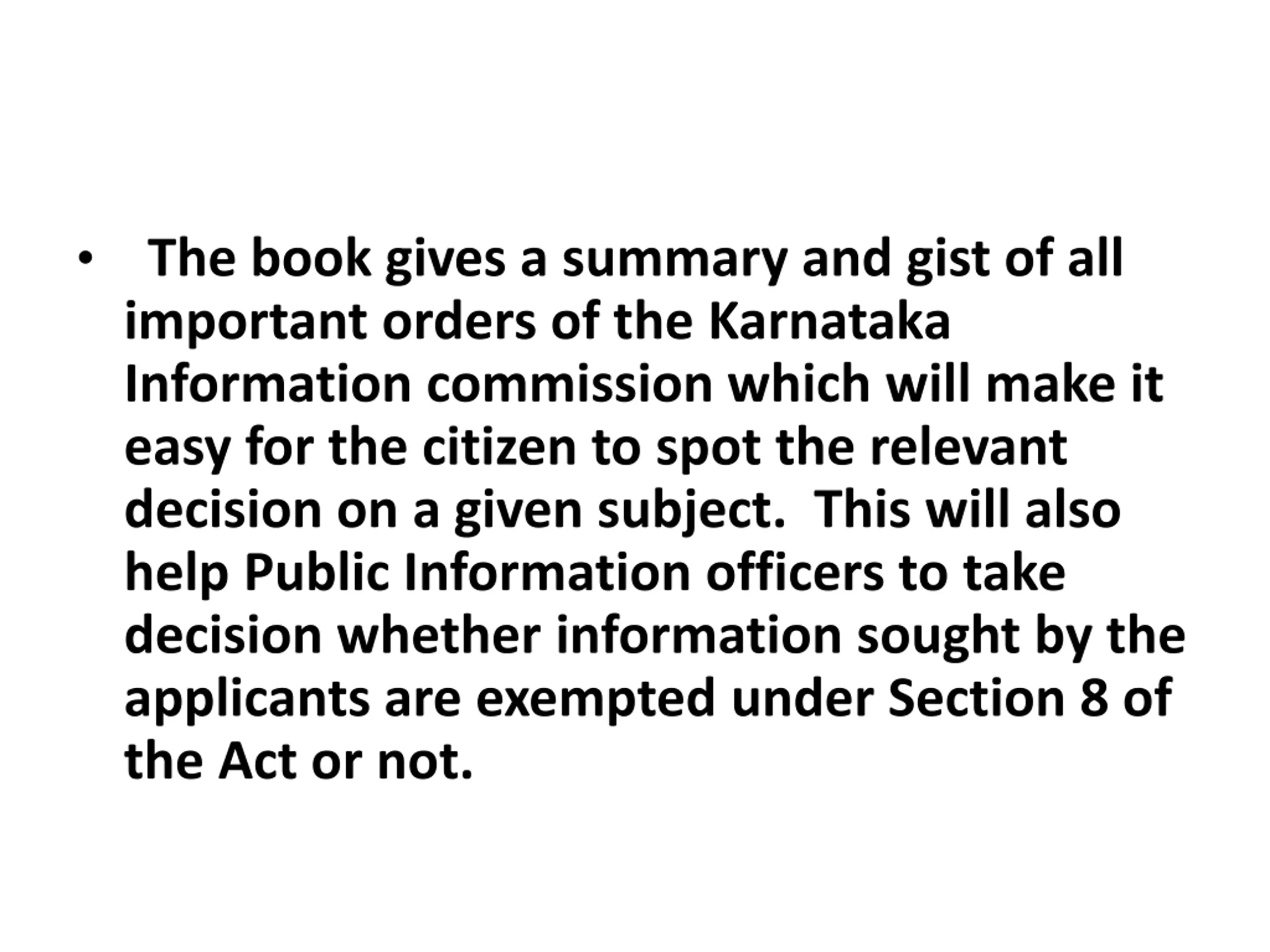 The book gives a summary and gist of all important orders of the Karnataka Information commission which will make it easy for the citizen to spot the relevant decision on a given subject. This will also help Public Information officers to take decision whether information sought by the applicants are exempted under Section 8 of the Act or not.