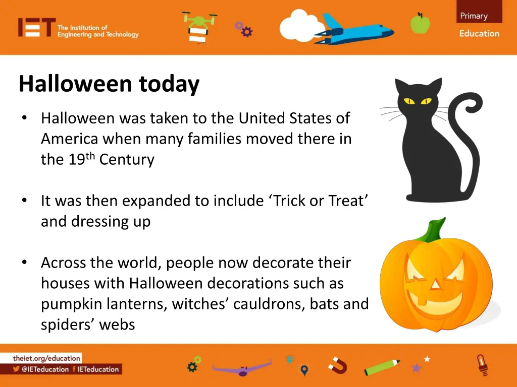 Halloween today Halloween was taken to the United States of America when many families moved there in the 19th Century It was then expanded to include Trick or Treat and dressing up Across the world, people now decorate their houses with Halloween decorations such as pumpkin lanterns, witches cauldrons, bats and spiders webs