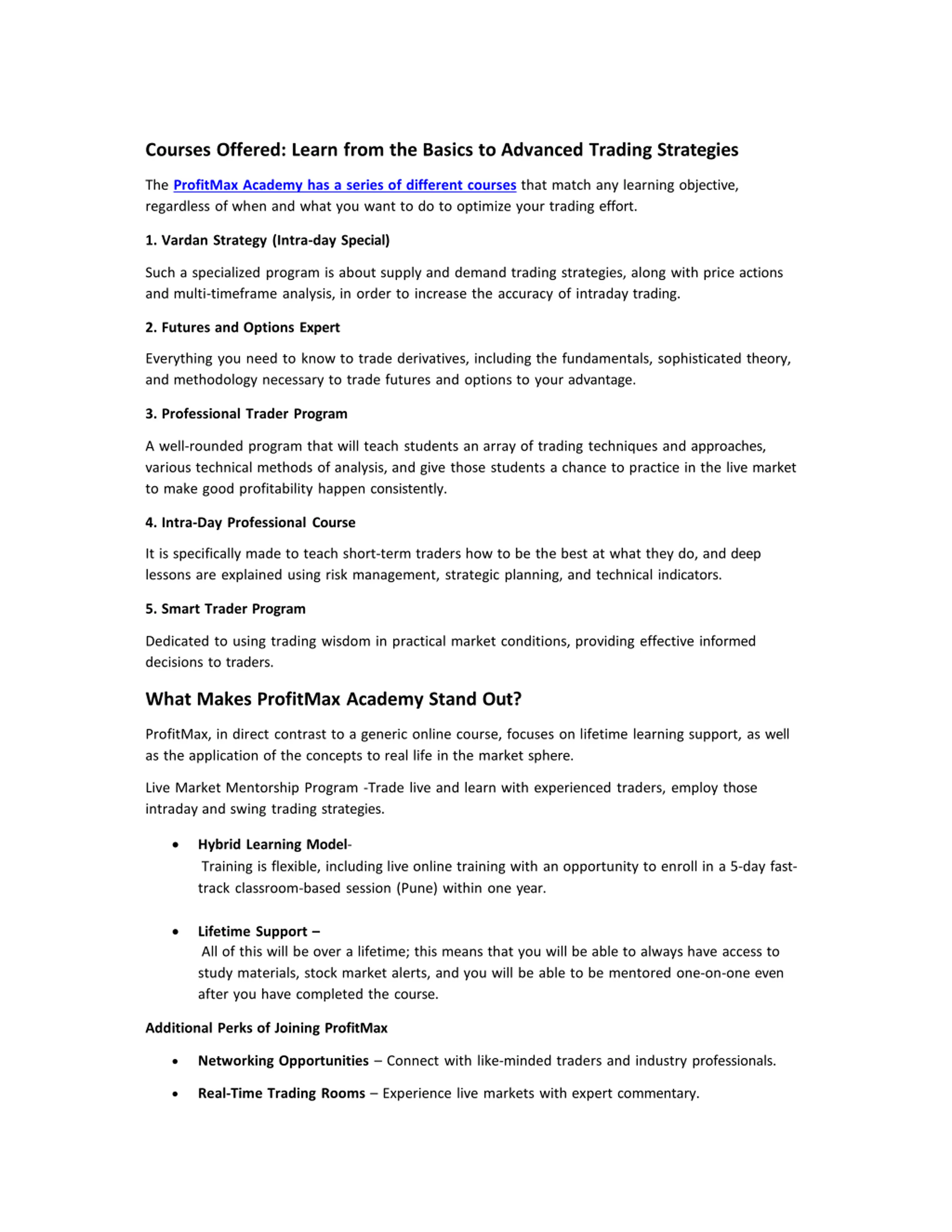 Courses Offered: Learn from the Basics to Advanced Trading Strategies The ProfitMax Academy has a series of different courses that match any learning objective, regardless of when and what you want to do to optimize your trading effort. 1. Vardan Strategy (Intra-day Special) Such a specialized program is about supply and demand trading strategies, along with price actions and multi-timeframe analysis, in order to increase the accuracy of intraday trading. 2. Futures and Options Expert Everything you need to know to trade derivatives, including the fundamentals, sophisticated theory, and methodology necessary to trade futures and options to your advantage. 3. Professional Trader Program A well-rounded program that will teach students an array of trading techniques and approaches, various technical methods of analysis, and give those students a chance to practice in the live market to make good profitability happen consistently. 4. Intra-Day Professional Course It is specifically made to teach short-term traders how to be the best at what they do, and deep lessons are explained using risk management, strategic planning, and technical indicators. 5. Smart Trader Program Dedicated to using trading wisdom in practical market conditions, providing effective informed decisions to traders. What Makes ProfitMax Academy Stand Out? ProfitMax, in direct contrast to a generic online course, focuses on lifetime learning support, as well as the application of the concepts to real life in the market sphere. Live Market Mentorship Program -Trade live and learn with experienced traders, employ those intraday and swing trading strategies. Hybrid Learning Model- Training is flexible, including live online training with an opportunity to enroll in a 5-day fast- track classroom-based session (Pune) within one year. Lifetime Support All of this will be over a lifetime; this means that you will be able to always have access to study materials, stock market alerts, and you will be able to be mentored one-on-one even after you have completed the course. Additional Perks of Joining ProfitMax Networking Opportunities Connect with like-minded traders and industry professionals. Real-Time Trading Rooms Experience live markets with expert commentary.