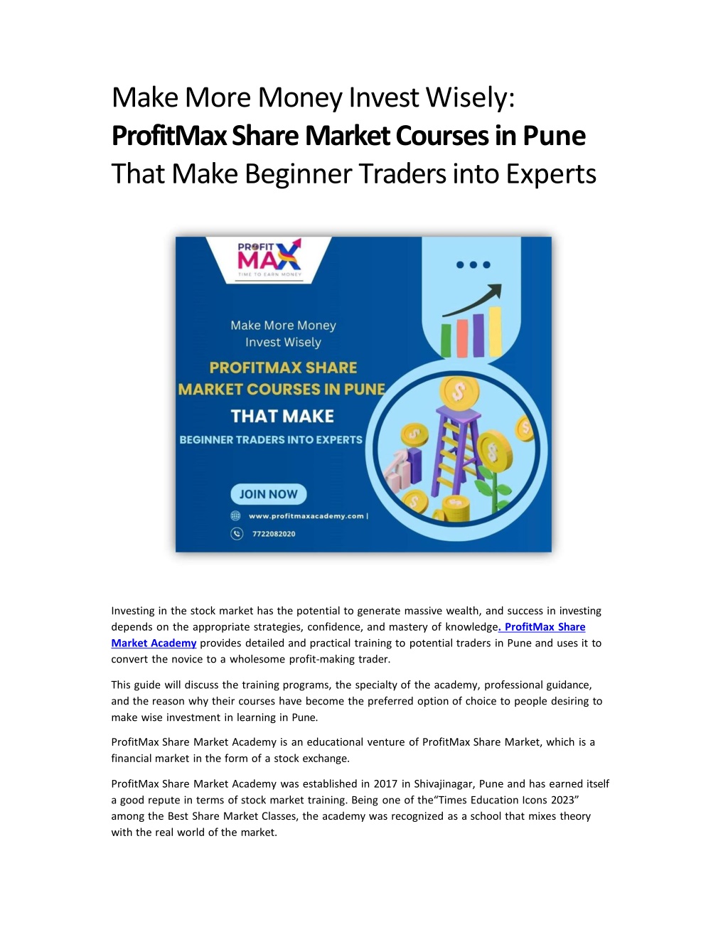 Make More Money Invest Wisely: ProfitMax Share Market Courses in Pune That Make Beginner Traders into Experts Investing in the stock market has the potential to generate massive wealth, and success in investing depends on the appropriate strategies, confidence, and mastery of knowledge. ProfitMax Share Market Academy provides detailed and practical training to potential traders in Pune and uses it to convert the novice to a wholesome profit-making trader. This guide will discuss the training programs, the specialty of the academy, professional guidance, and the reason why their courses have become the preferred option of choice to people desiring to make wise investment in learning in Pune. ProfitMax Share Market Academy is an educational venture of ProfitMax Share Market, which is a financial market in the form of a stock exchange. ProfitMax Share Market Academy was established in 2017 in Shivajinagar, Pune and has earned itself a good repute in terms of stock market training. Being one of the Times Education Icons 2023 among the Best Share Market Classes, the academy was recognized as a school that mixes theory with the real world of the market.