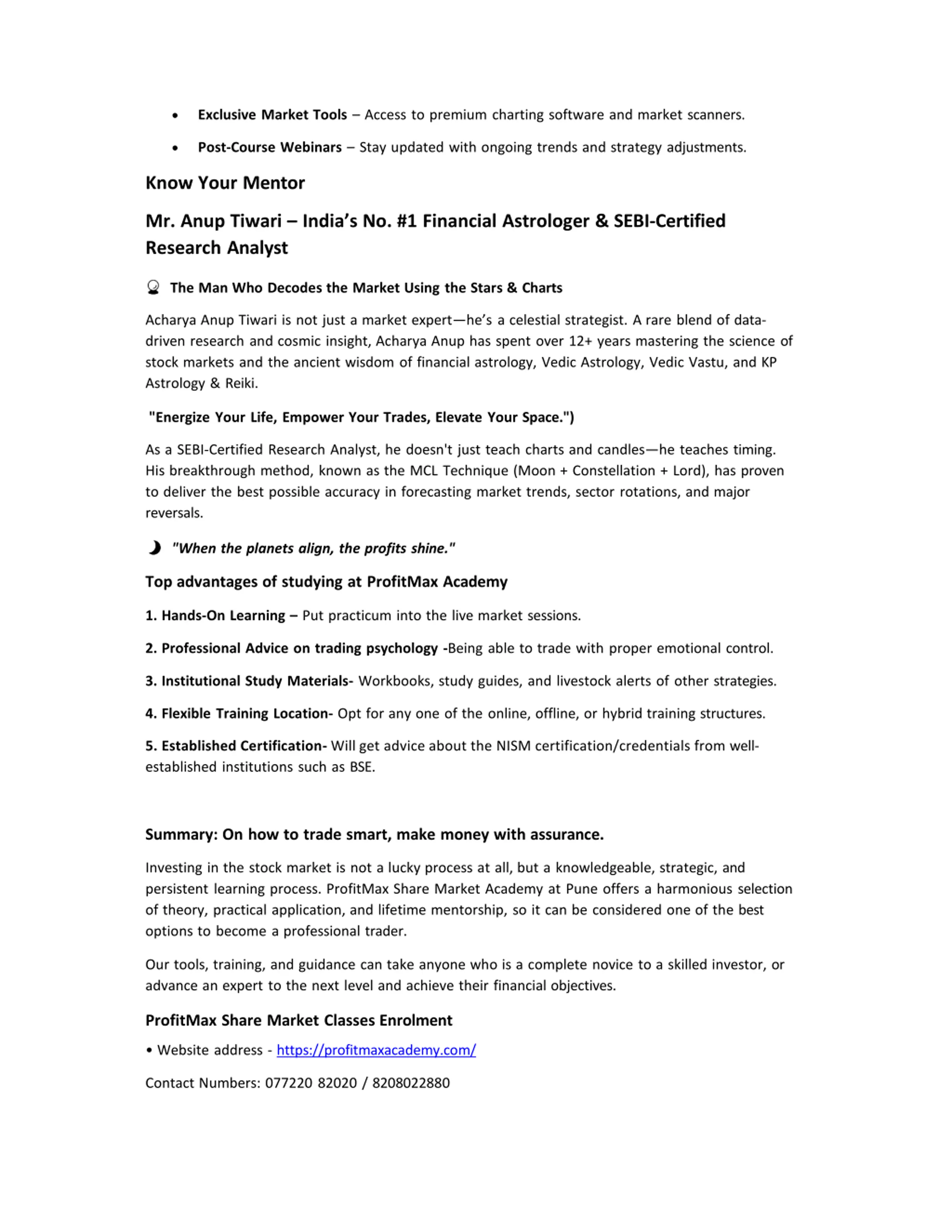 Exclusive Market Tools Access to premium charting software and market scanners. Post-Course Webinars Stay updated with ongoing trends and strategy adjustments. Know Your Mentor Mr. Anup Tiwari India s No. #1 Financial Astrologer & SEBI-Certified Research Analyst The Man Who Decodes the Market Using the Stars & Charts Acharya Anup Tiwari is not just a market expert he s a celestial strategist. A rare blend of data- driven research and cosmic insight, Acharya Anup has spent over 12+ years mastering the science of stock markets and the ancient wisdom of financial astrology, Vedic Astrology, Vedic Vastu, and KP Astrology & Reiki. "Energize Your Life, Empower Your Trades, Elevate Your Space.") As a SEBI-Certified Research Analyst, he doesn't just teach charts and candles he teaches timing. His breakthrough method, known as the MCL Technique (Moon + Constellation + Lord), has proven to deliver the best possible accuracy in forecasting market trends, sector rotations, and major reversals. "When the planets align, the profits shine." Top advantages of studying at ProfitMax Academy 1. Hands-On Learning Put practicum into the live market sessions. 2. Professional Advice on trading psychology -Being able to trade with proper emotional control. 3. Institutional Study Materials- Workbooks, study guides, and livestock alerts of other strategies. 4. Flexible Training Location- Opt for any one of the online, offline, or hybrid training structures. 5. Established Certification- Will get advice about the NISM certification/credentials from well- established institutions such as BSE. Summary: On how to trade smart, make money with assurance. Investing in the stock market is not a lucky process at all, but a knowledgeable, strategic, and persistent learning process. ProfitMax Share Market Academy at Pune offers a harmonious selection of theory, practical application, and lifetime mentorship, so it can be considered one of the best options to become a professional trader. Our tools, training, and guidance can take anyone who is a complete novice to a skilled investor, or advance an expert to the next level and achieve their financial objectives. ProfitMax Share Market Classes Enrolment Website address - https://profitmaxacademy.com/ Contact Numbers: 077220 82020 / 8208022880