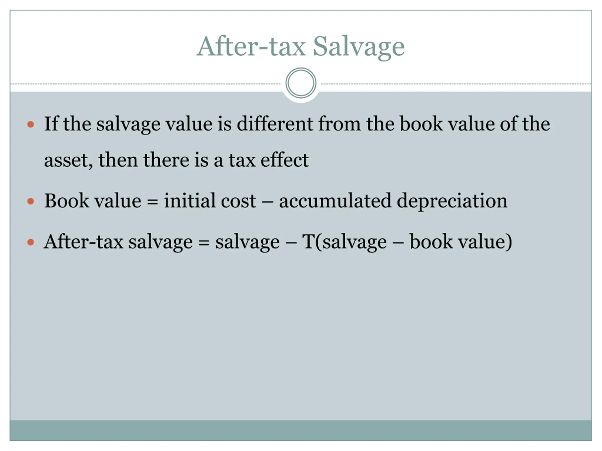 After-tax Salvage If the salvage value is different from the book value of the asset, then there is a tax effect Book value = initial cost accumulated depreciation After-tax salvage = salvage T(salvage book value)