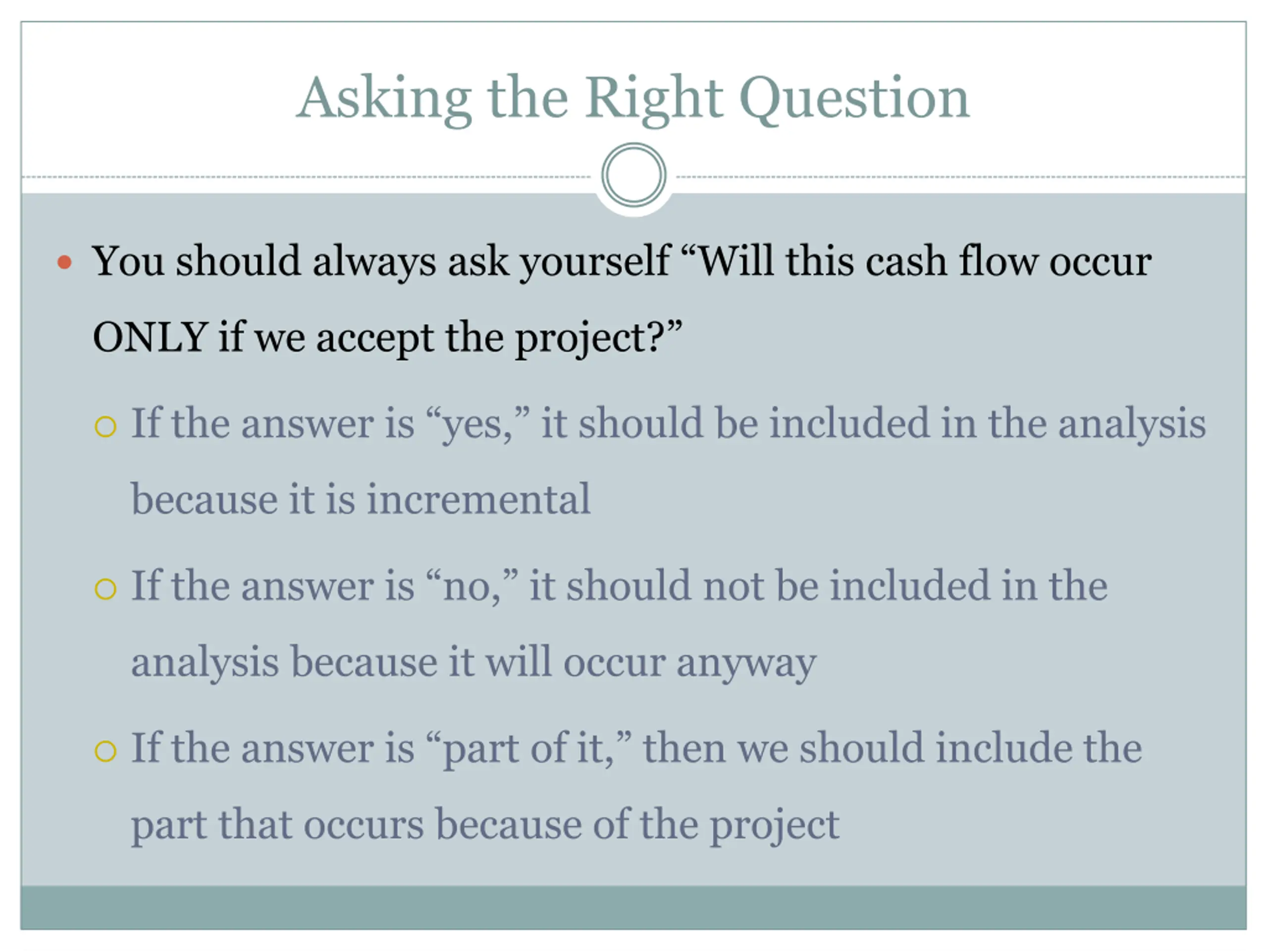Asking the Right Question You should always ask yourself Will this cash flow occur ONLY if we accept the project? If the answer is yes, it should be included in the analysis because it is incremental If the answer is no, it should not be included in the analysis because it will occur anyway If the answer is part of it, then we should include the part that occurs because of the project