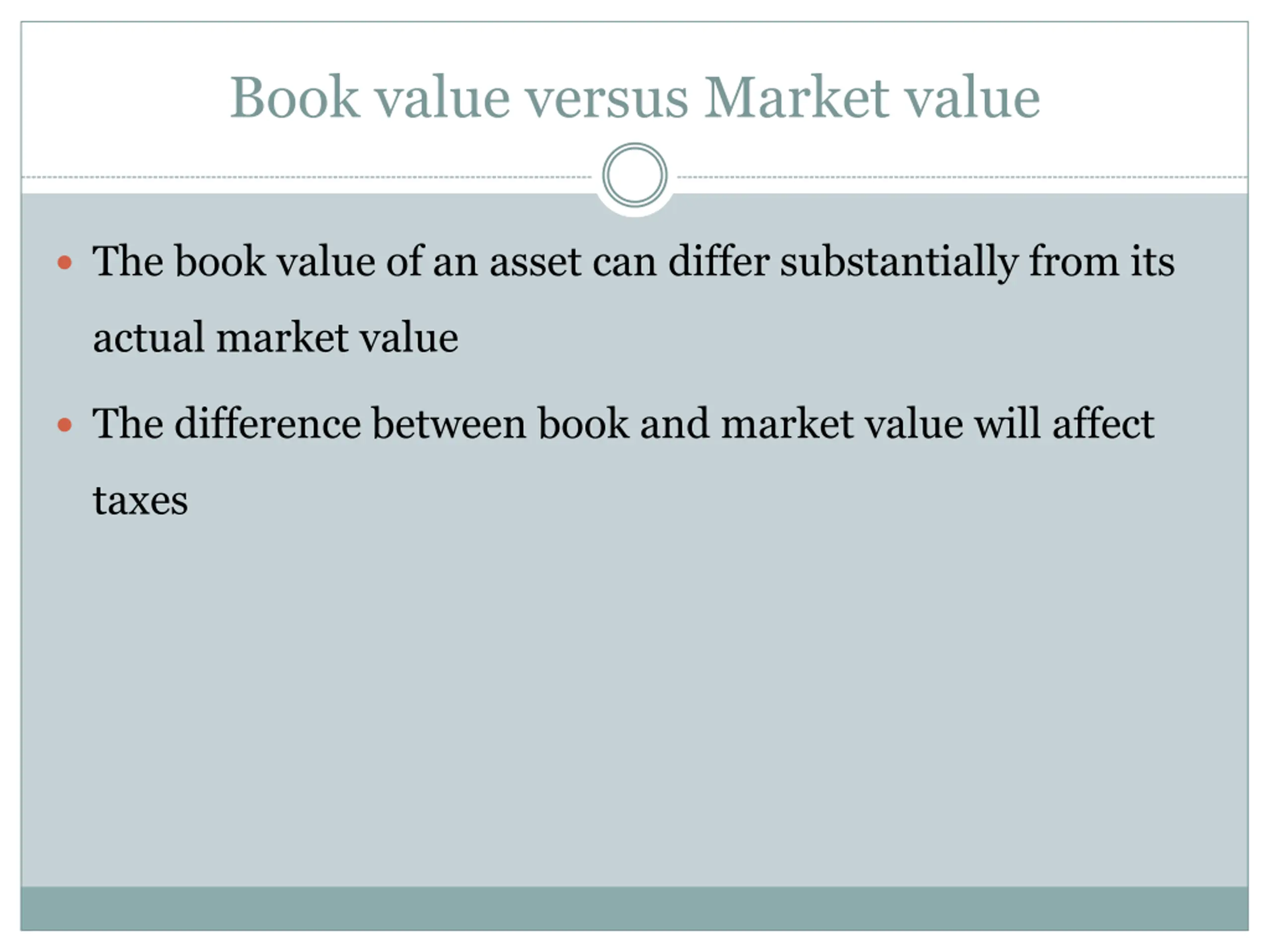 Book value versus Market value The book value of an asset can differ substantially from its actual market value The difference between book and market value will affect taxes