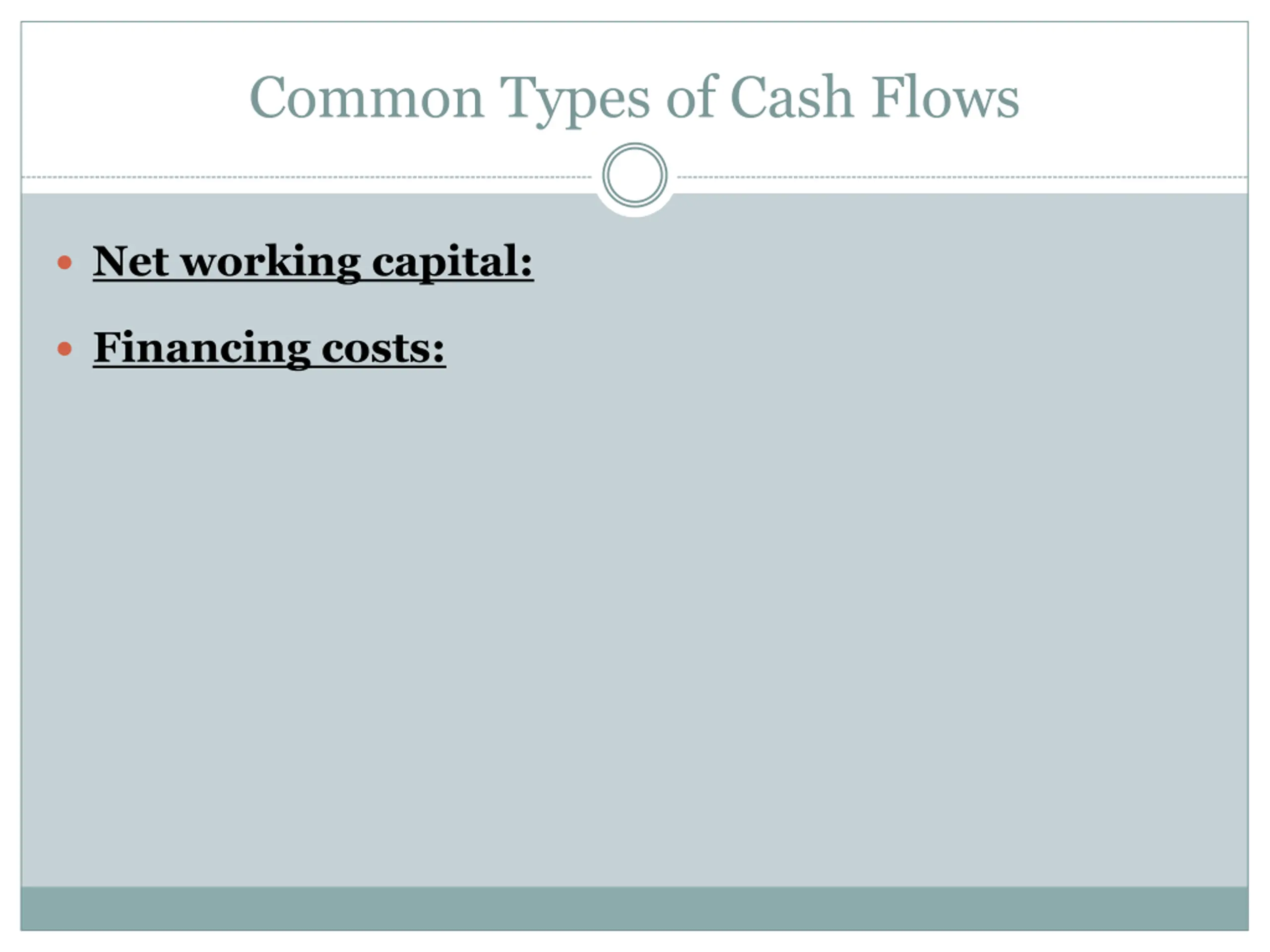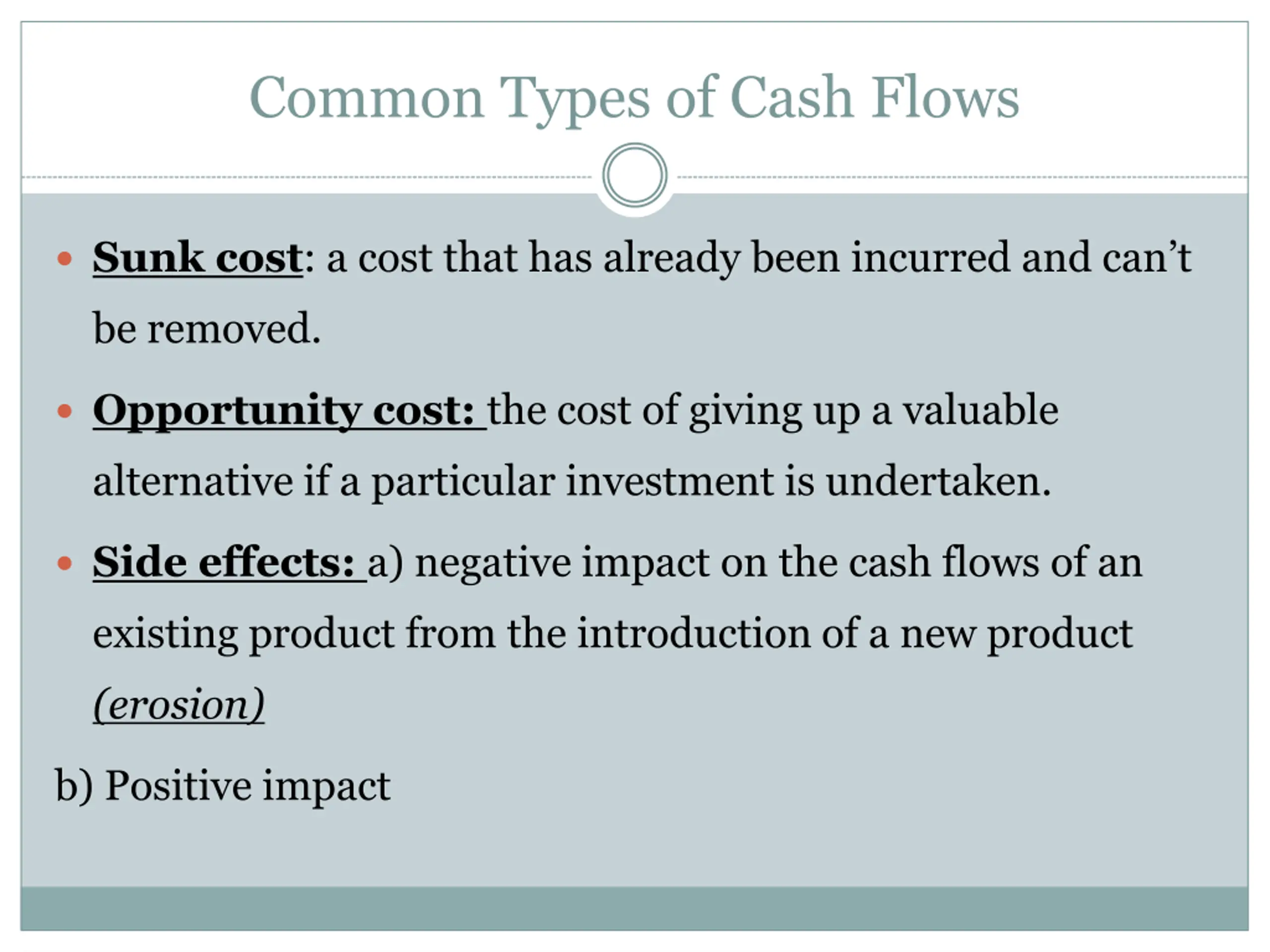Common Types of Cash Flows Sunk cost: a cost that has already been incurred and can t be removed. Opportunity cost: the cost of giving up a valuable alternative if a particular investment is undertaken. Side effects: a) negative impact on the cash flows of an existing product from the introduction of a new product (erosion) b) Positive impact