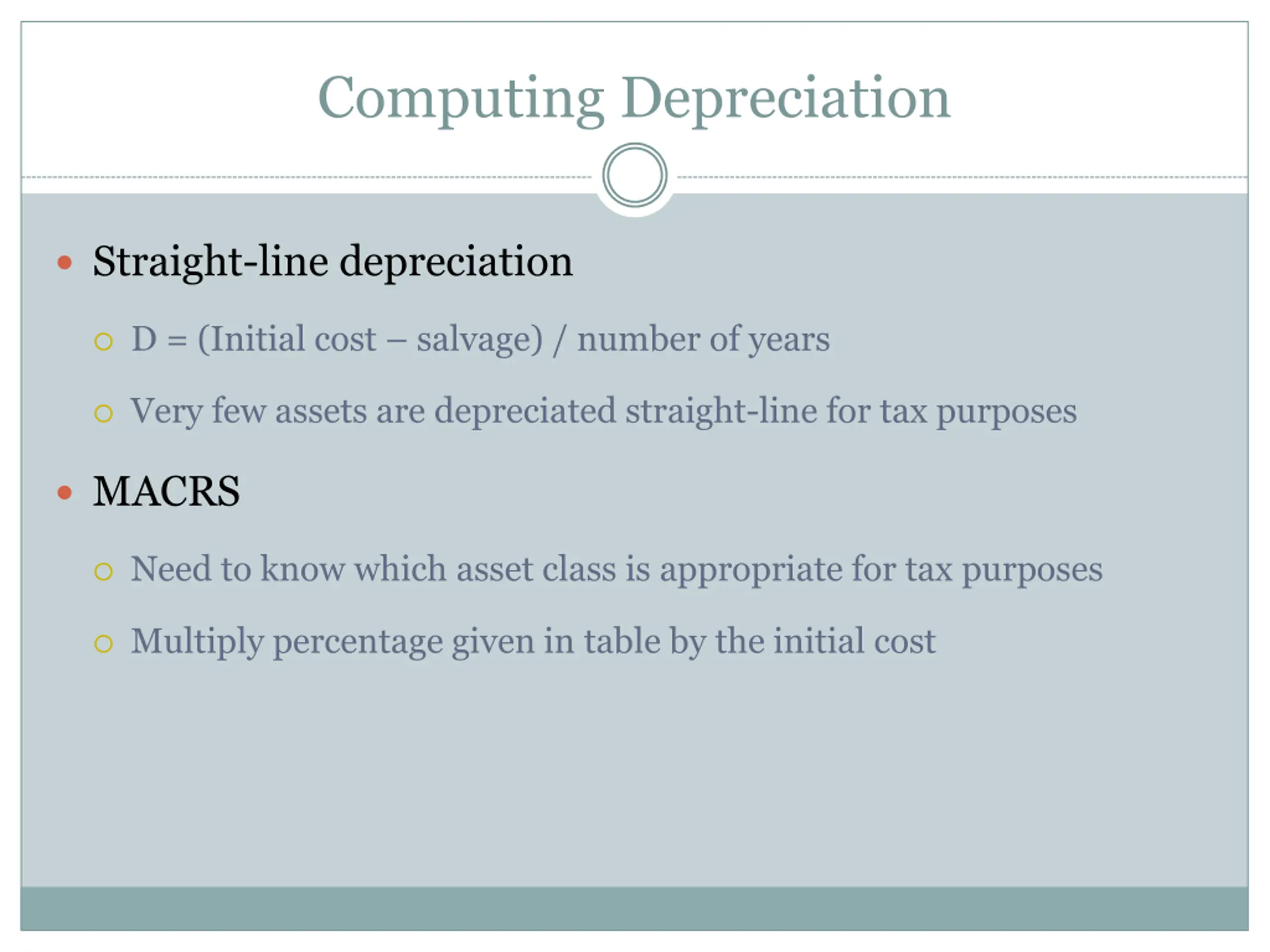 Computing Depreciation Straight-line depreciation D = (Initial cost salvage) / number of years Very few assets are depreciated straight-line for tax purposes MACRS Need to know which asset class is appropriate for tax purposes Multiply percentage given in table by the initial cost