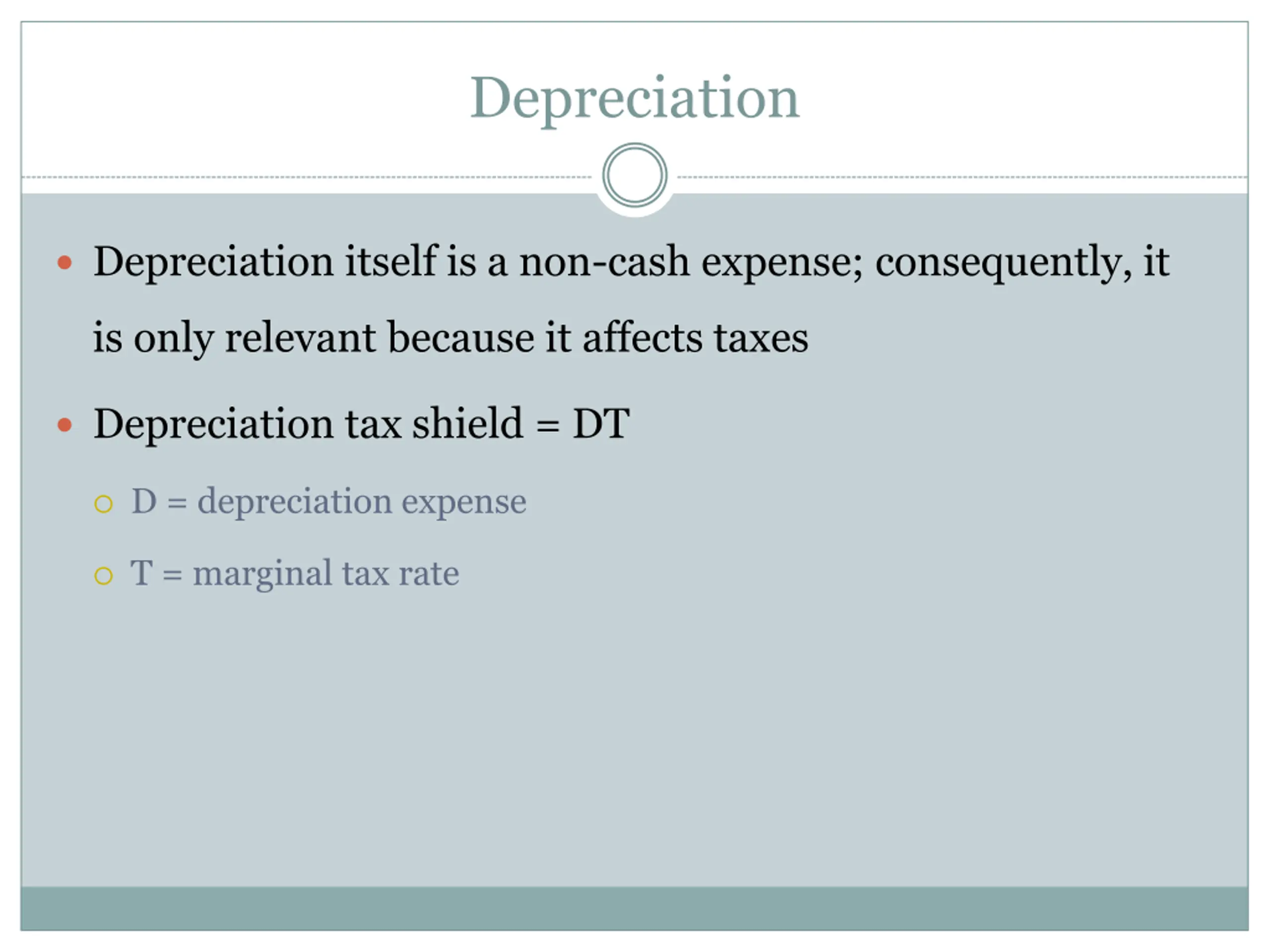 Depreciation Depreciation itself is a non-cash expense; consequently, it is only relevant because it affects taxes Depreciation tax shield = DT D = depreciation expense T = marginal tax rate