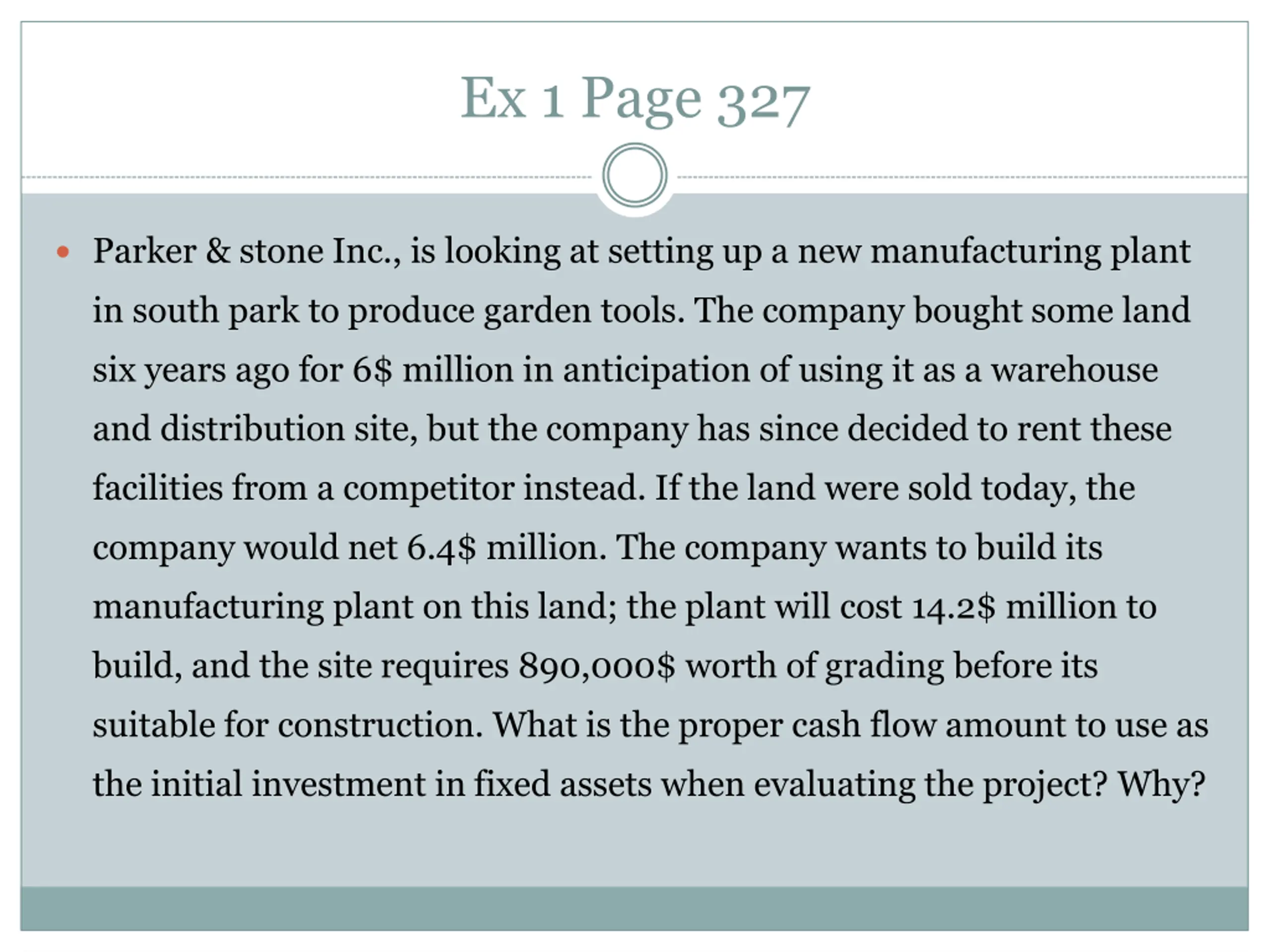 Ex 1 Page 327 Parker & stone Inc., is looking at setting up a new manufacturing plant in south park to produce garden tools. The company bought some land six years ago for 6$ million in anticipation of using it as a warehouse and distribution site, but the company has since decided to rent these facilities from a competitor instead. If the land were sold today, the company would net 6.4$ million. The company wants to build its manufacturing plant on this land; the plant will cost 14.2$ million to build, and the site requires 890,000$ worth of grading before its suitable for construction. What is the proper cash flow amount to use as the initial investment in fixed assets when evaluating the project? Why?