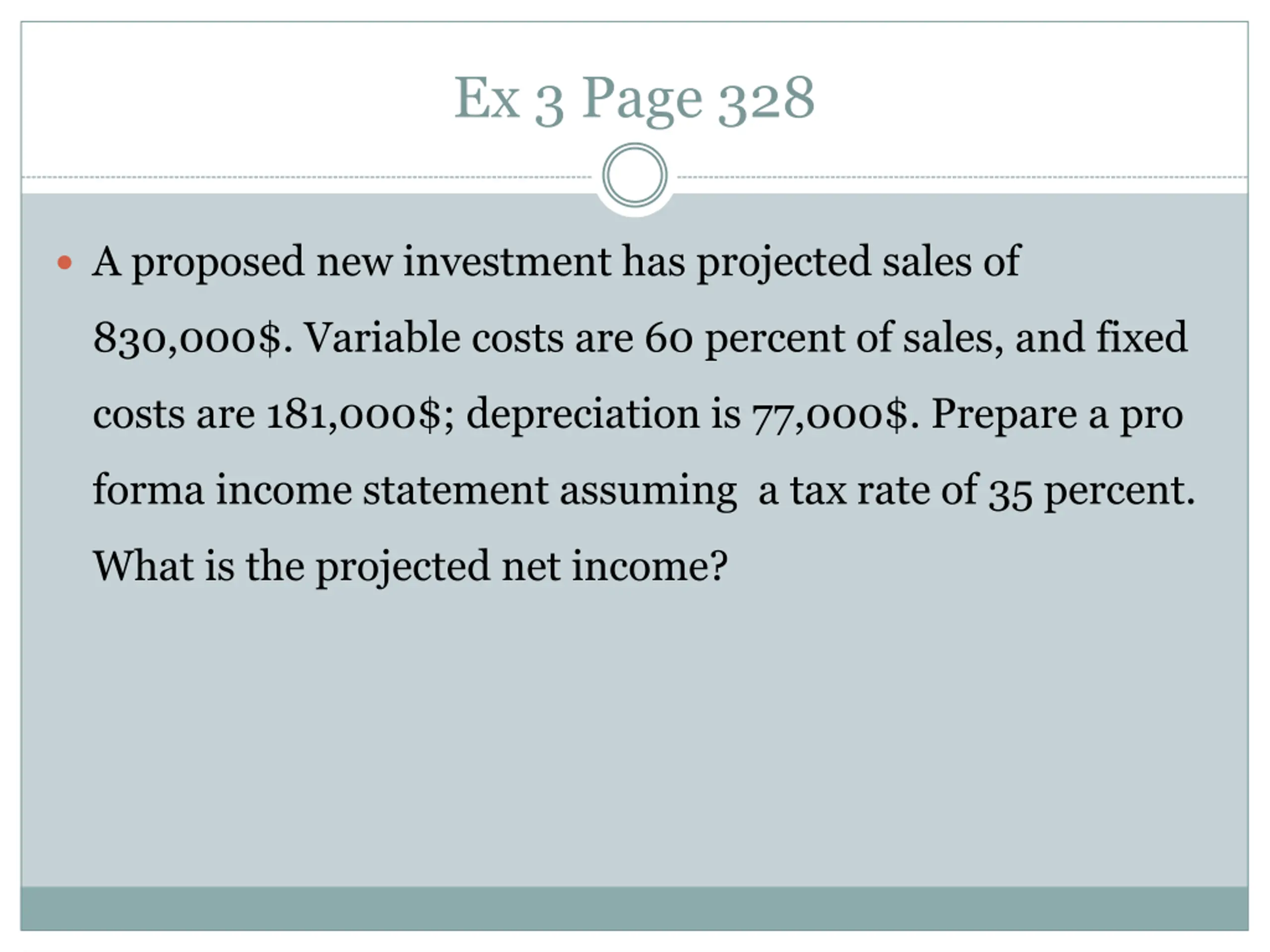 Ex 3 Page 328 A proposed new investment has projected sales of 830,000$. Variable costs are 60 percent of sales, and fixed costs are 181,000$; depreciation is 77,000$. Prepare a pro forma income statement assuming a tax rate of 35 percent. What is the projected net income?