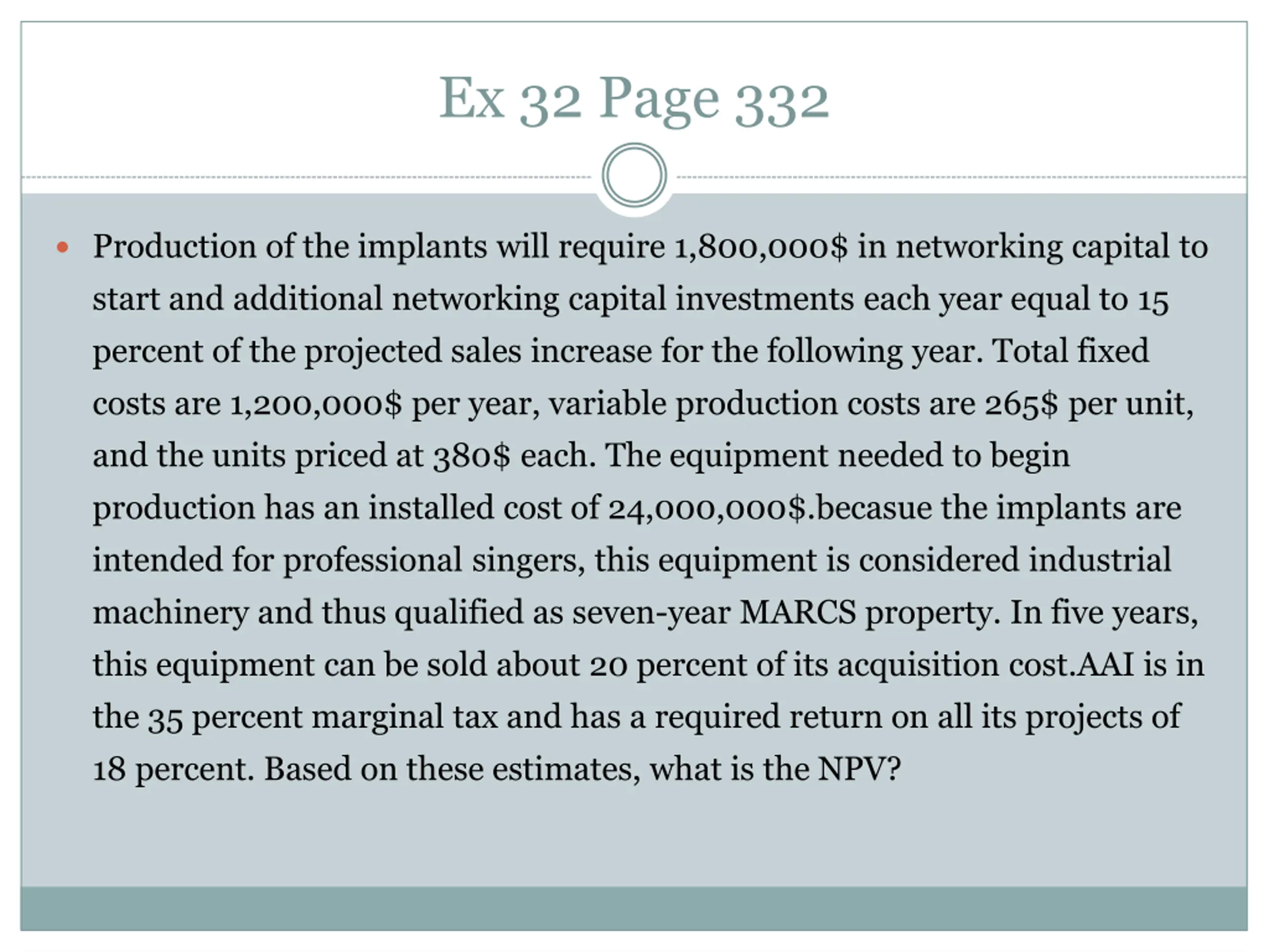 Ex 32 Page 332 Production of the implants will require 1,800,000$ in networking capital to start and additional networking capital investments each year equal to 15 percent of the projected sales increase for the following year. Total fixed costs are 1,200,000$ per year, variable production costs are 265$ per unit, and the units priced at 380$ each. The equipment needed to begin production has an installed cost of 24,000,000$.becasue the implants are intended for professional singers, this equipment is considered industrial machinery and thus qualified as seven-year MARCS property. In five years, this equipment can be sold about 20 percent of its acquisition cost.AAI is in the 35 percent marginal tax and has a required return on all its projects of 18 percent. Based on these estimates, what is the NPV?