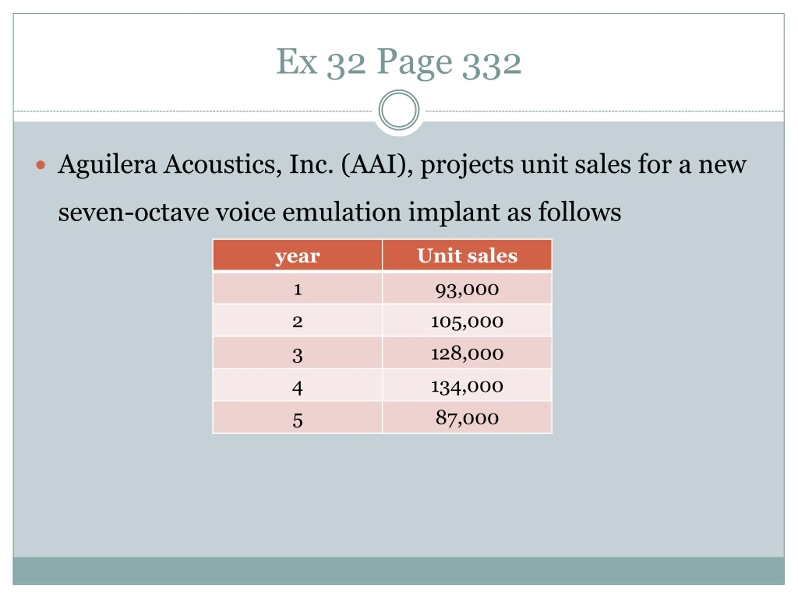 Ex 32 Page 332 Aguilera Acoustics, Inc. (AAI), projects unit sales for a new seven-octave voice emulation implant as follows year 1 2 3 4 5 Unit sales 93,000 105,000 128,000 134,000 87,000