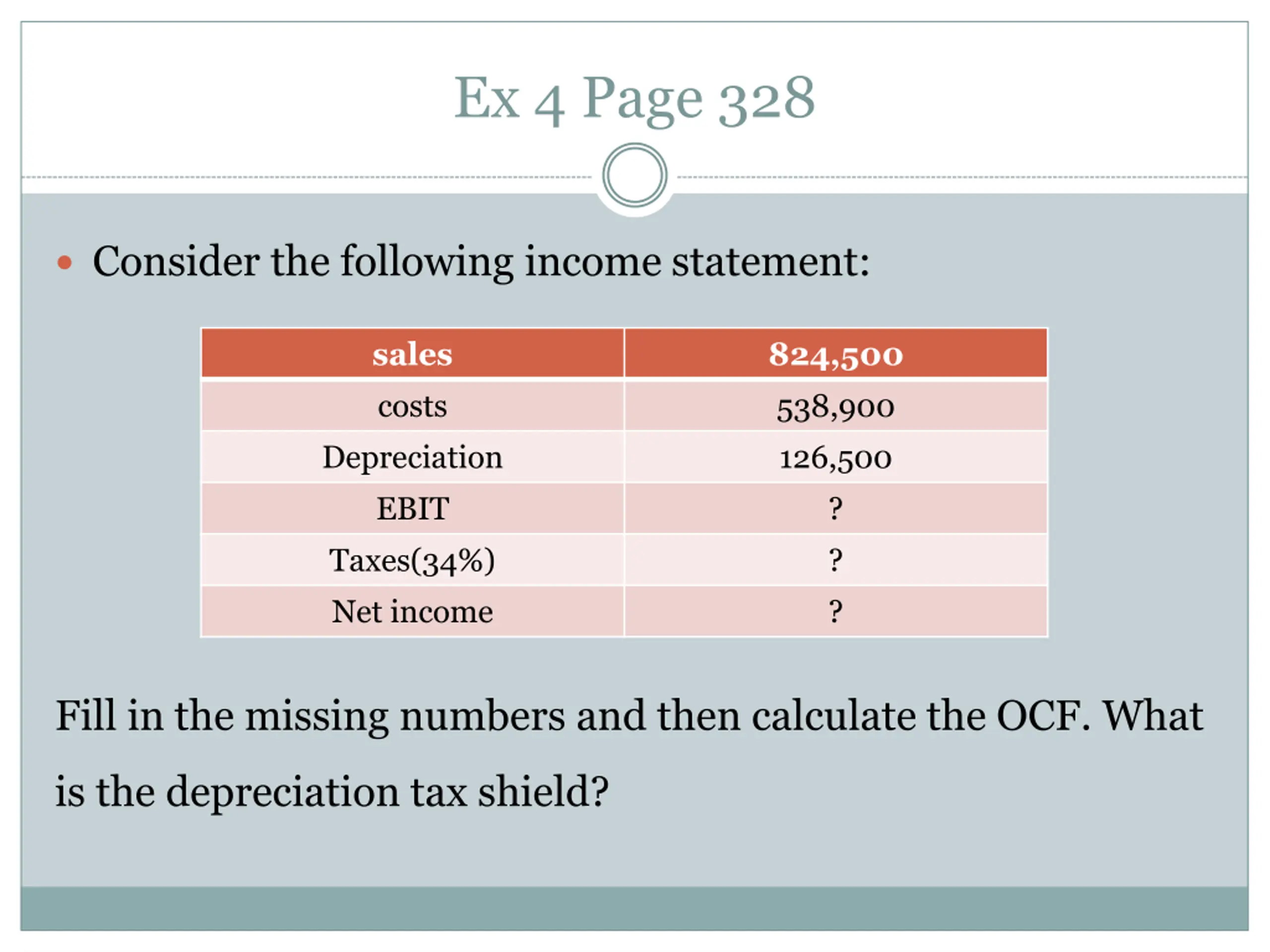 Ex 4 Page 328 Consider the following income statement: sales costs 824,500 538,900 126,500 ? ? ? Depreciation EBIT Taxes(34%) Net income Fill in the missing numbers and then calculate the OCF. What is the depreciation tax shield?