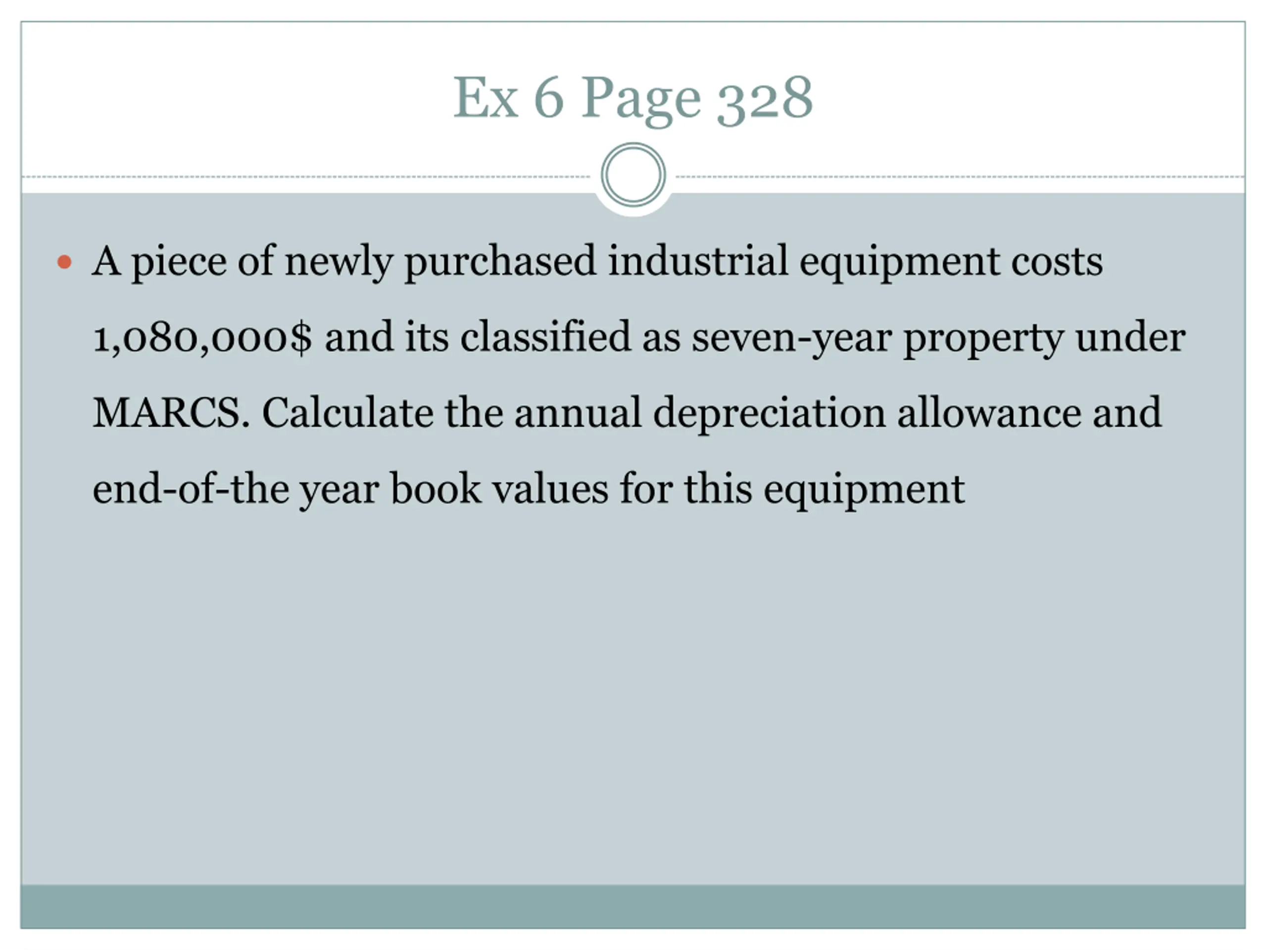 Ex 6 Page 328 A piece of newly purchased industrial equipment costs 1,080,000$ and its classified as seven-year property under MARCS. Calculate the annual depreciation allowance and end-of-the year book values for this equipment