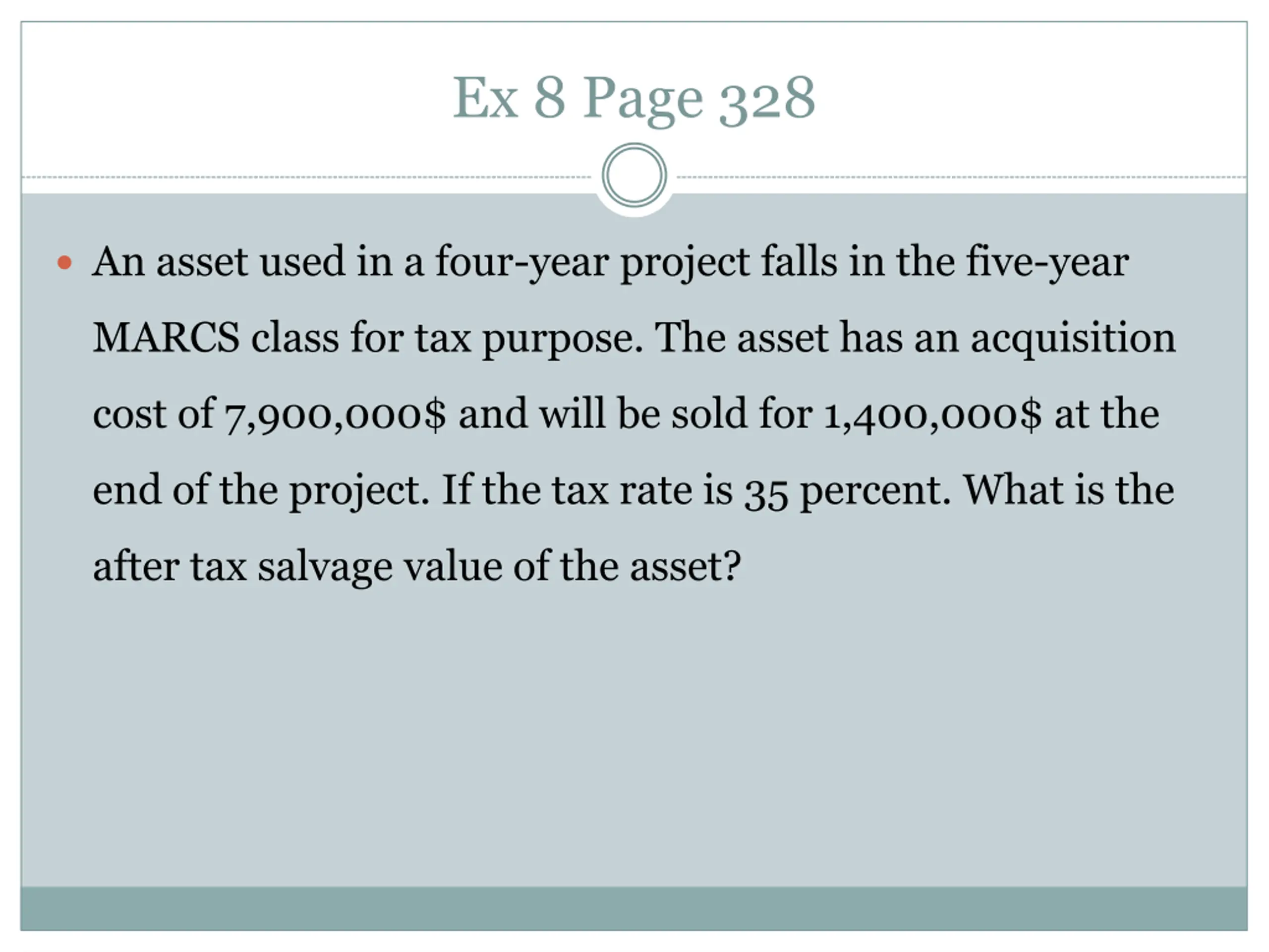 Ex 8 Page 328 An asset used in a four-year project falls in the five-year MARCS class for tax purpose. The asset has an acquisition cost of 7,900,000$ and will be sold for 1,400,000$ at the end of the project. If the tax rate is 35 percent. What is the after tax salvage value of the asset?