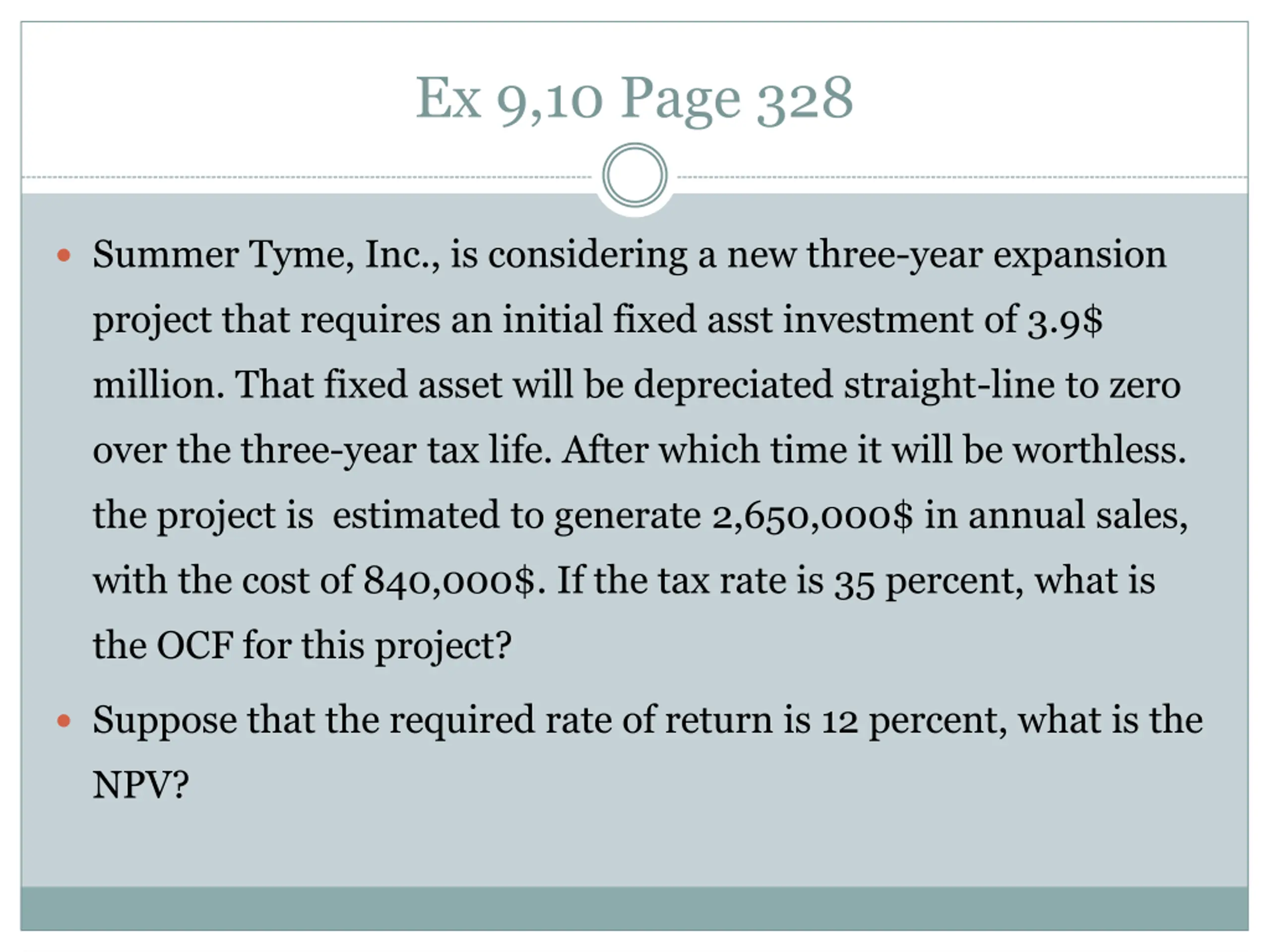 Ex 9,10 Page 328 Summer Tyme, Inc., is considering a new three-year expansion project that requires an initial fixed asst investment of 3.9$ million. That fixed asset will be depreciated straight-line to zero over the three-year tax life. After which time it will be worthless. the project is estimated to generate 2,650,000$ in annual sales, with the cost of 840,000$. If the tax rate is 35 percent, what is the OCF for this project? Suppose that the required rate of return is 12 percent, what is the NPV?