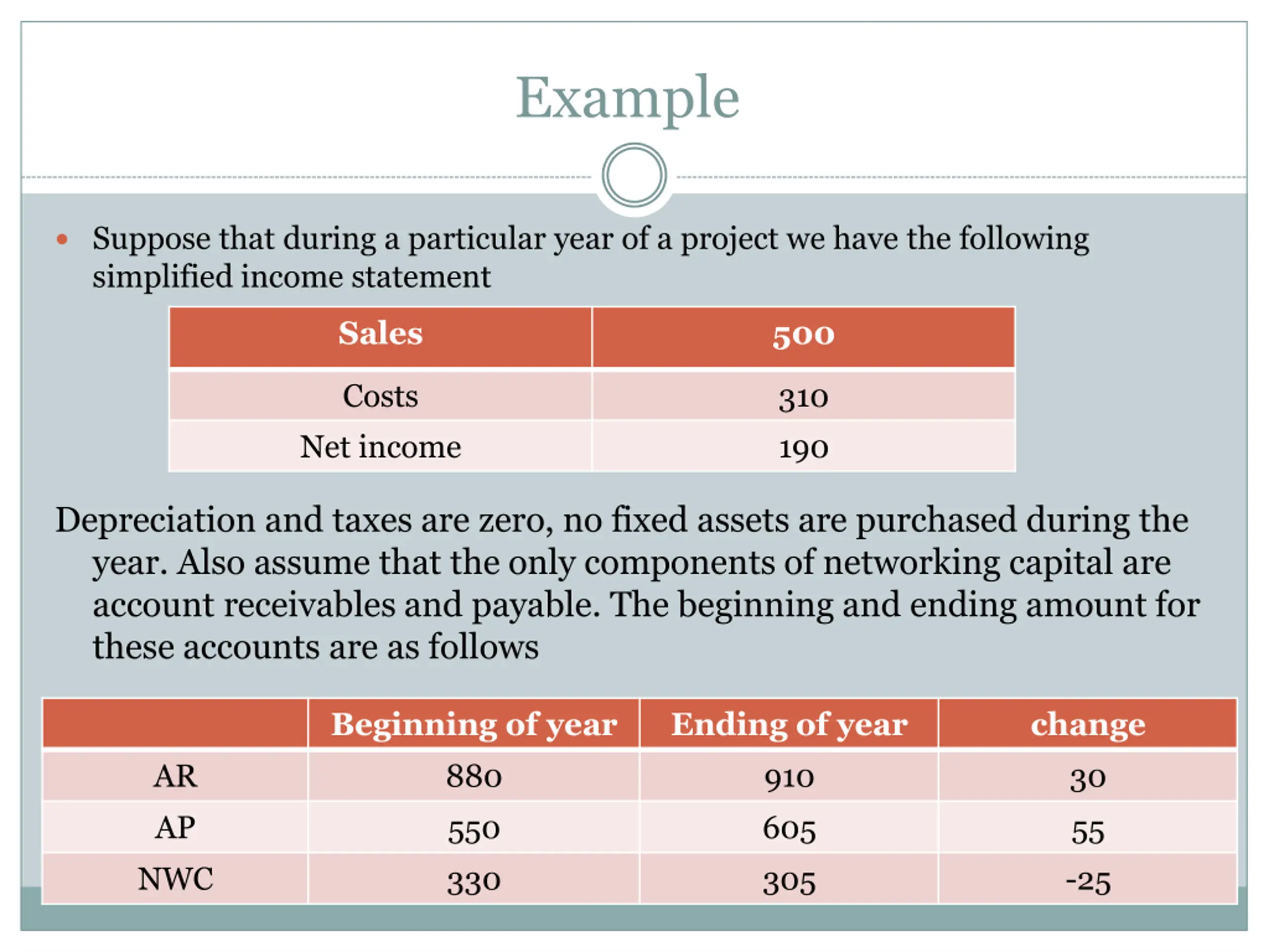 Example Suppose that during a particular year of a project we have the following simplified income statement Sales 500 Costs 310 190 Net income Depreciation and taxes are zero, no fixed assets are purchased during the year. Also assume that the only components of networking capital are account receivables and payable. The beginning and ending amount for these accounts are as follows Beginning of year 880 550 330 Ending of year 910 605 305 change 30 55 -25 AR AP NWC
