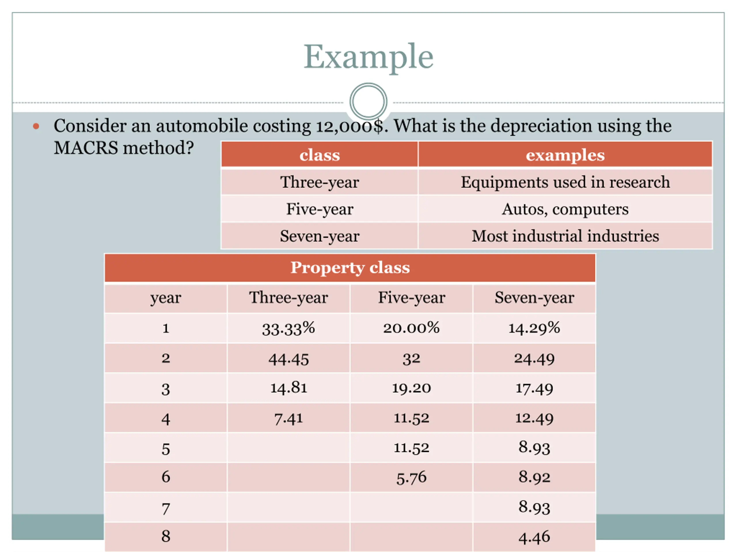 Example Consider an automobile costing 12,000$. What is the depreciation using the MACRS method? class examples Three-year Equipments used in research Five-year Autos, computers Seven-year Most industrial industries Property class year Three-year Five-year Seven-year 1 33.33% 20.00% 14.29% 2 44.45 32 24.49 3 14.81 19.20 17.49 4 7.41 11.52 12.49 5 11.52 8.93 6 5.76 8.92 7 8.93 8 4.46