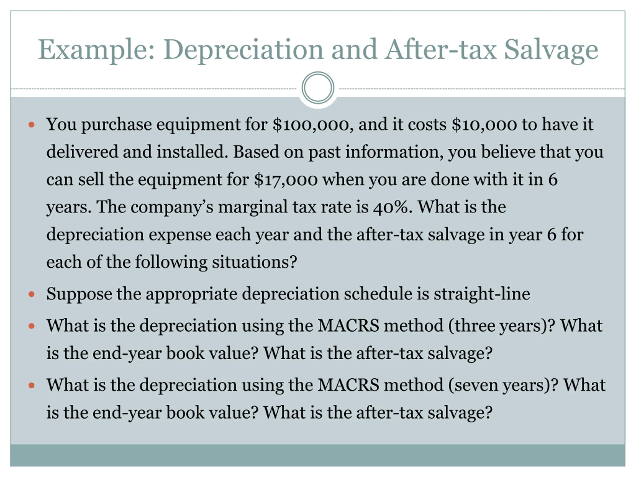 Example: Depreciation and After-tax Salvage You purchase equipment for $100,000, and it costs $10,000 to have it delivered and installed. Based on past information, you believe that you can sell the equipment for $17,000 when you are done with it in 6 years. The company s marginal tax rate is 40%. What is the depreciation expense each year and the after-tax salvage in year 6 for each of the following situations? Suppose the appropriate depreciation schedule is straight-line What is the depreciation using the MACRS method (three years)? What is the end-year book value? What is the after-tax salvage? What is the depreciation using the MACRS method (seven years)? What is the end-year book value? What is the after-tax salvage?