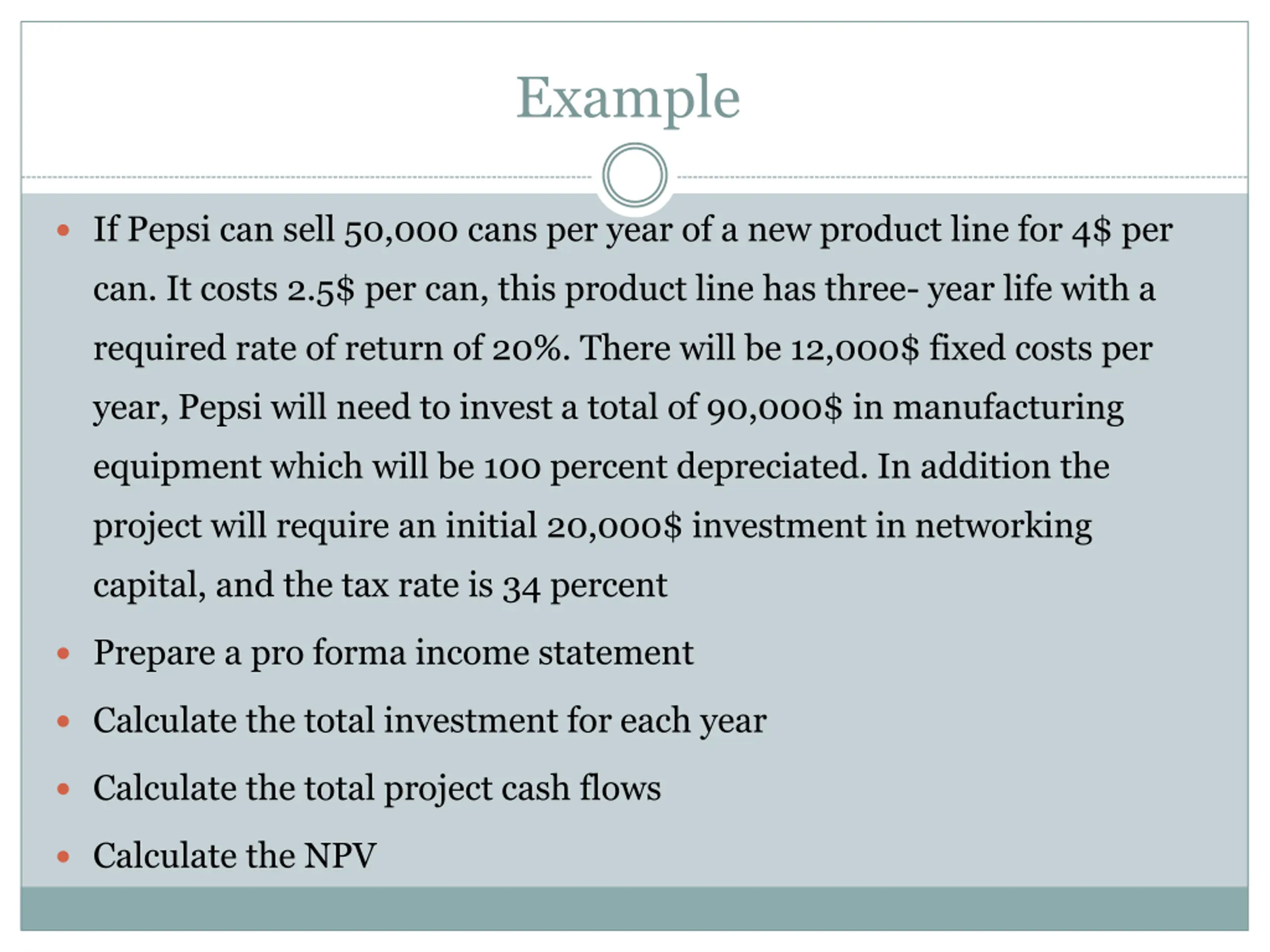 Example If Pepsi can sell 50,000 cans per year of a new product line for 4$ per can. It costs 2.5$ per can, this product line has three- year life with a required rate of return of 20%. There will be 12,000$ fixed costs per year, Pepsi will need to invest a total of 90,000$ in manufacturing equipment which will be 100 percent depreciated. In addition the project will require an initial 20,000$ investment in networking capital, and the tax rate is 34 percent Prepare a pro forma income statement Calculate the total investment for each year Calculate the total project cash flows Calculate the NPV