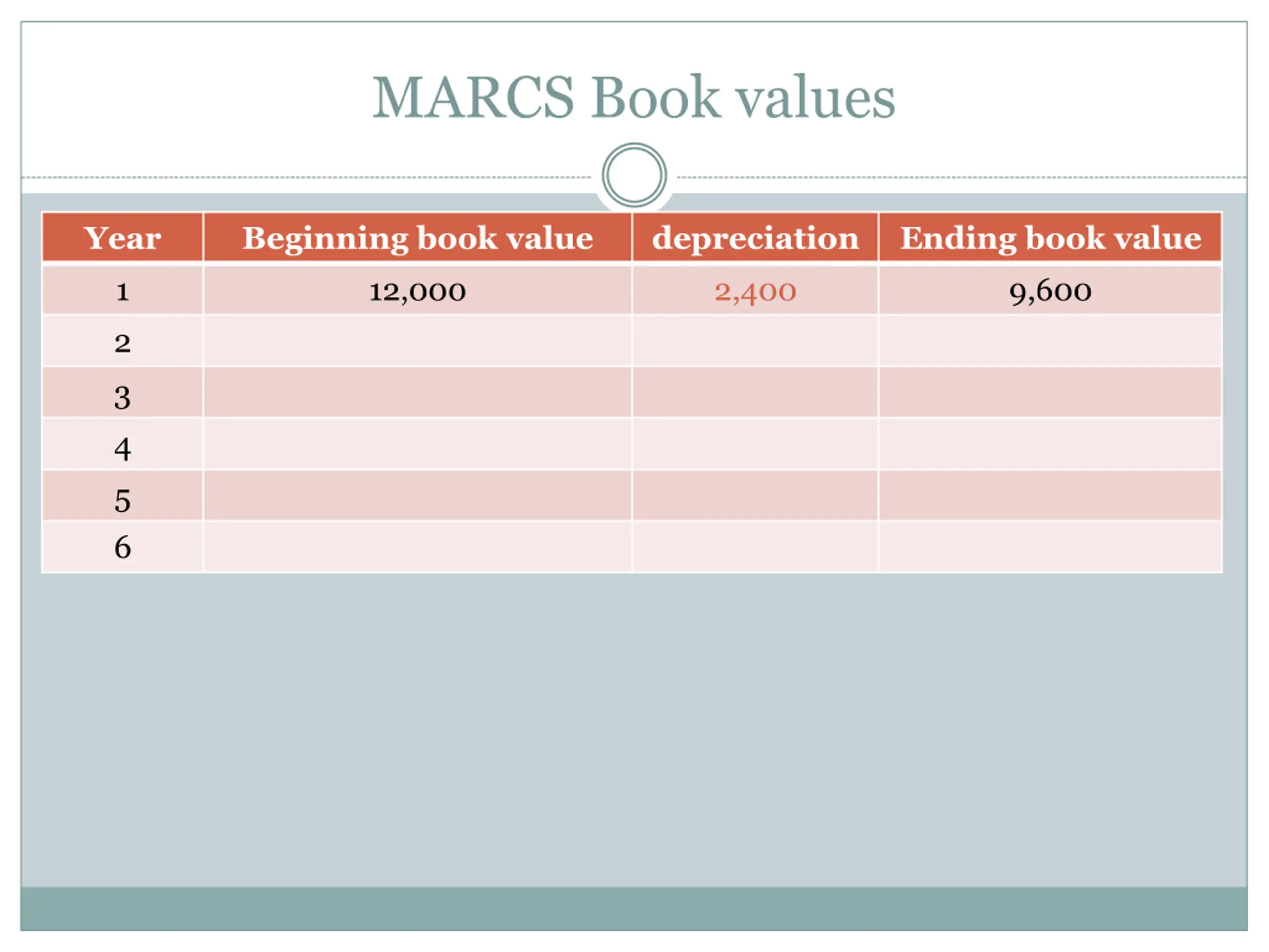 MARCS Book values Year 1 2 3 4 5 6 Beginning book value 12,000 depreciation 2,400 Ending book value 9,600