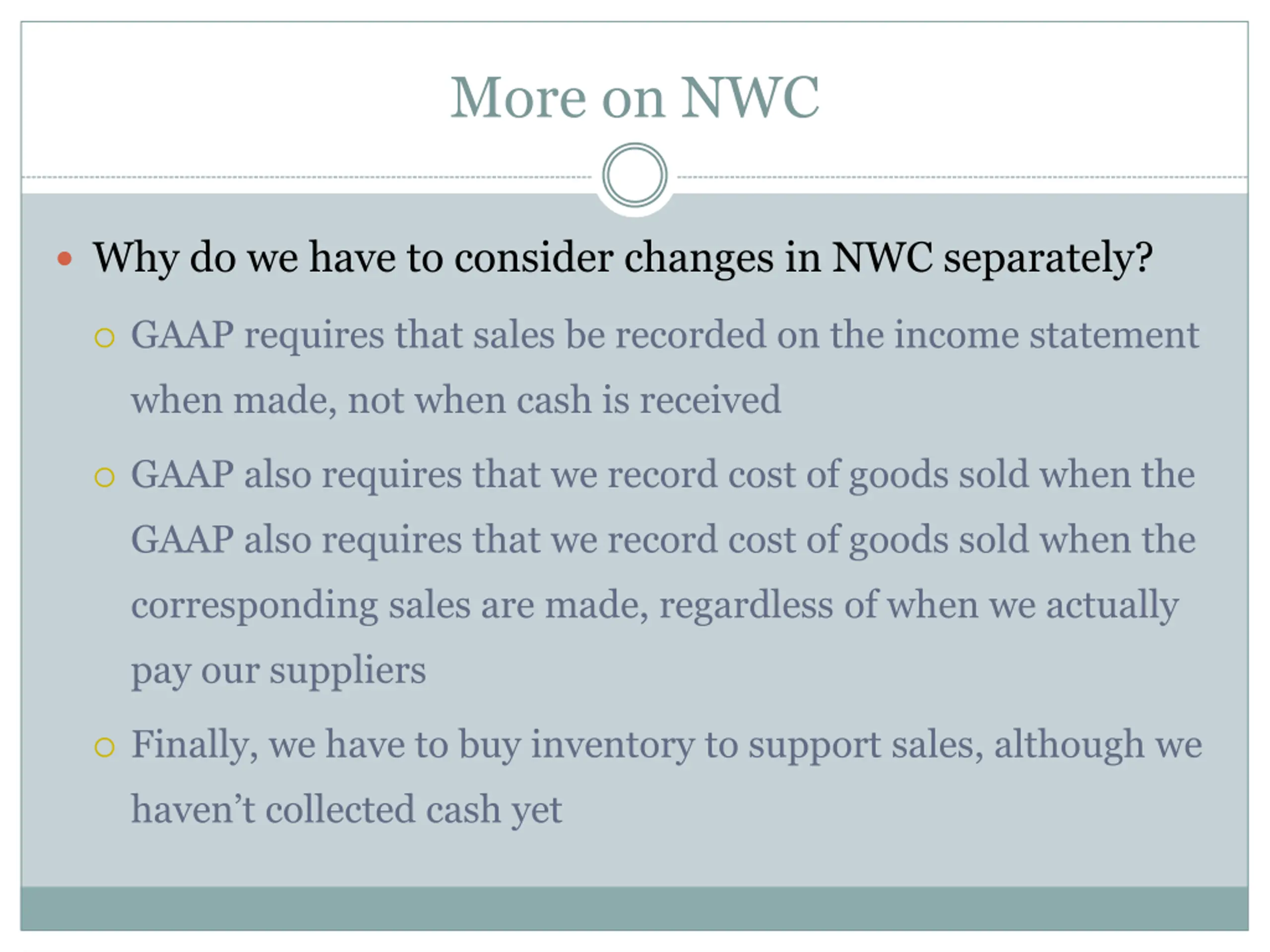 More on NWC Why do we have to consider changes in NWC separately? GAAP requires that sales be recorded on the income statement when made, not when cash is received GAAP also requires that we record cost of goods sold when the GAAP also requires that we record cost of goods sold when the corresponding sales are made, regardless of when we actually pay our suppliers Finally, we have to buy inventory to support sales, although we haven t collected cash yet