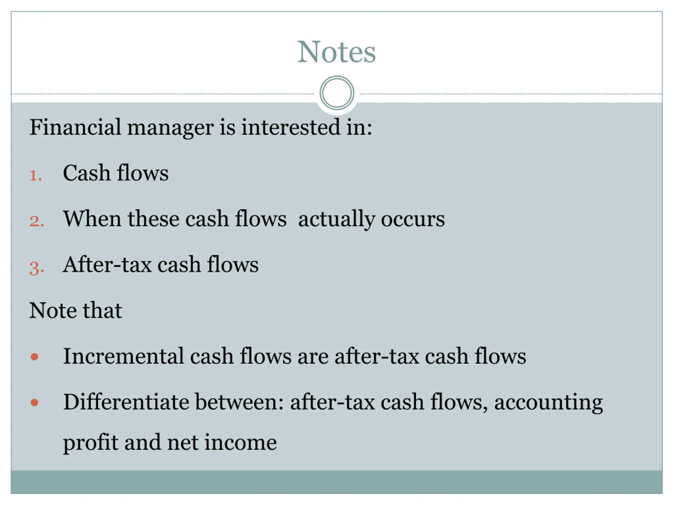Notes Financial manager is interested in: Cash flows 1. 2. When these cash flows actually occurs 3. After-tax cash flows Note that Incremental cash flows are after-tax cash flows Differentiate between: after-tax cash flows, accounting profit and net income