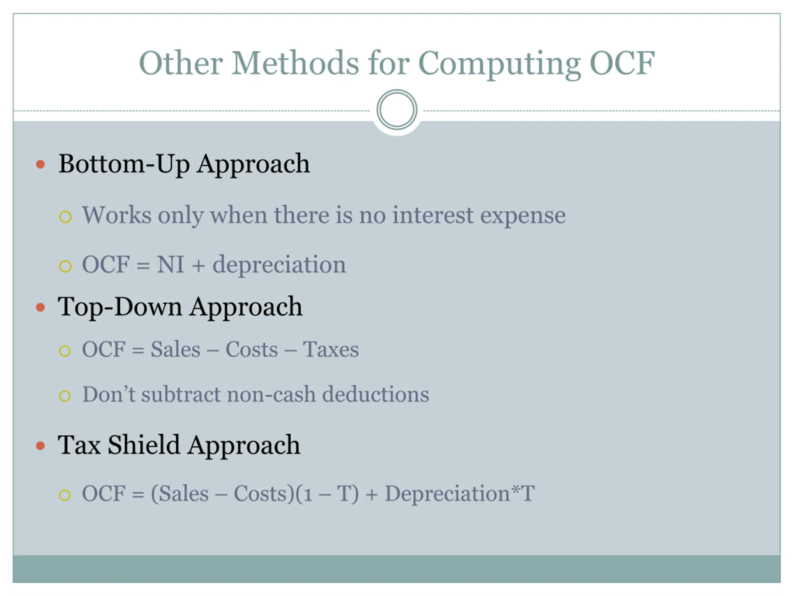 Other Methods for Computing OCF Bottom-Up Approach Works only when there is no interest expense OCF = NI + depreciation Top-Down Approach OCF = Sales Costs Taxes Don t subtract non-cash deductions Tax Shield Approach OCF = (Sales Costs)(1 T) + Depreciation*T