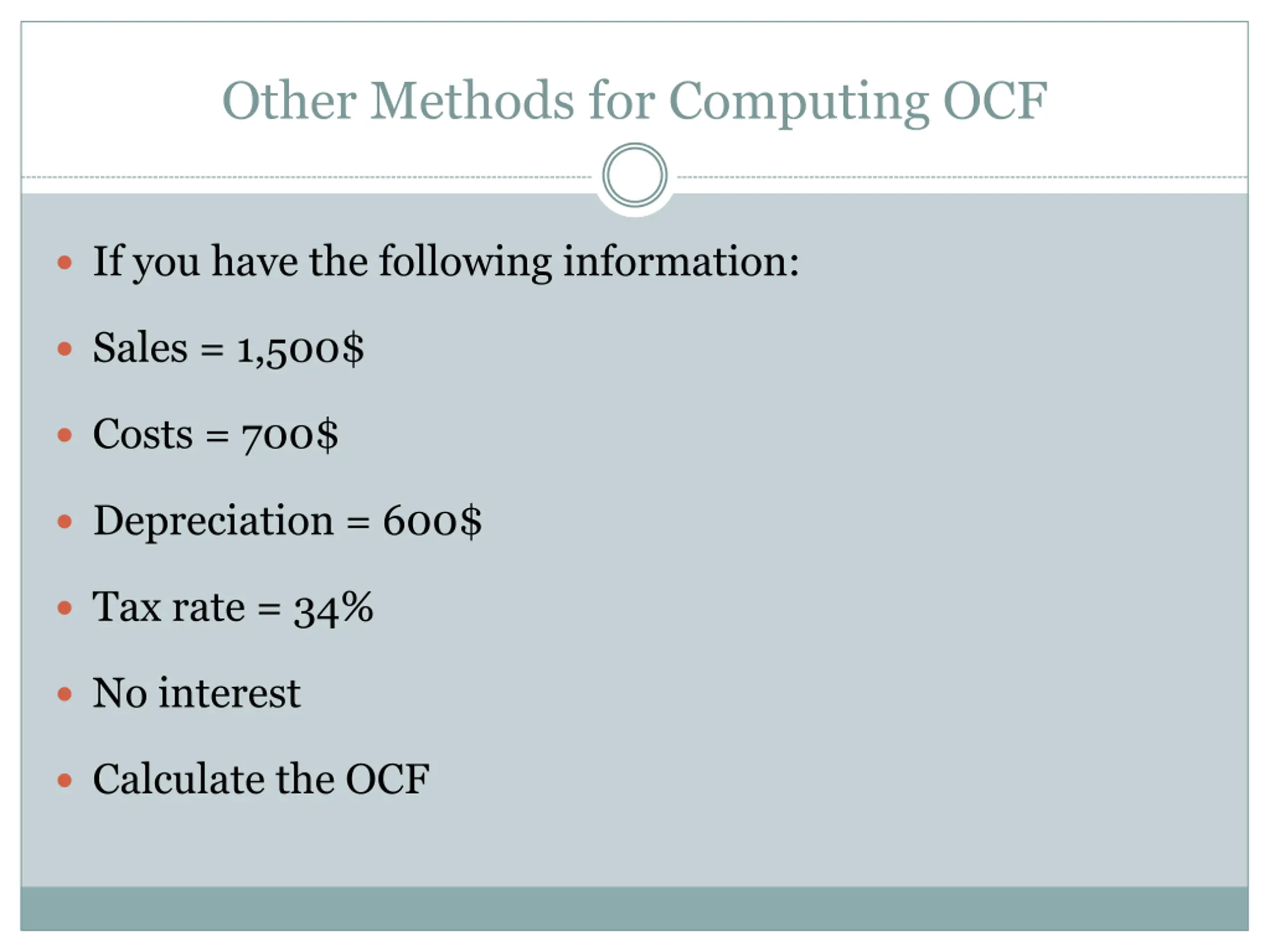Other Methods for Computing OCF If you have the following information: Sales = 1,500$ Costs = 700$ Depreciation = 600$ Tax rate = 34% No interest Calculate the OCF