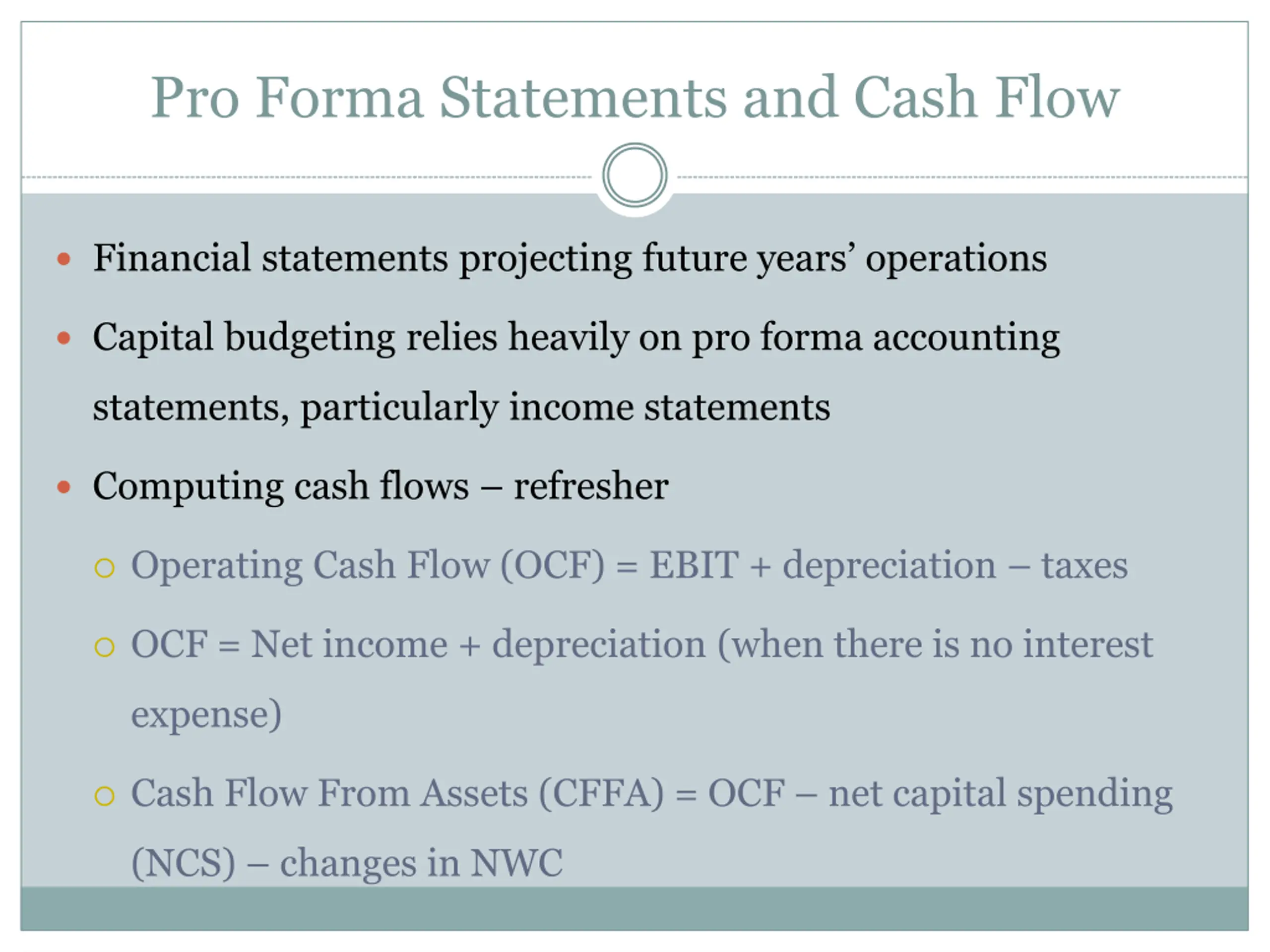 Pro Forma Statements and Cash Flow Financial statements projecting future years operations Capital budgeting relies heavily on pro forma accounting statements, particularly income statements Computing cash flows refresher Operating Cash Flow (OCF) = EBIT + depreciation taxes OCF = Net income + depreciation (when there is no interest expense) Cash Flow From Assets (CFFA) = OCF net capital spending (NCS) changes in NWC