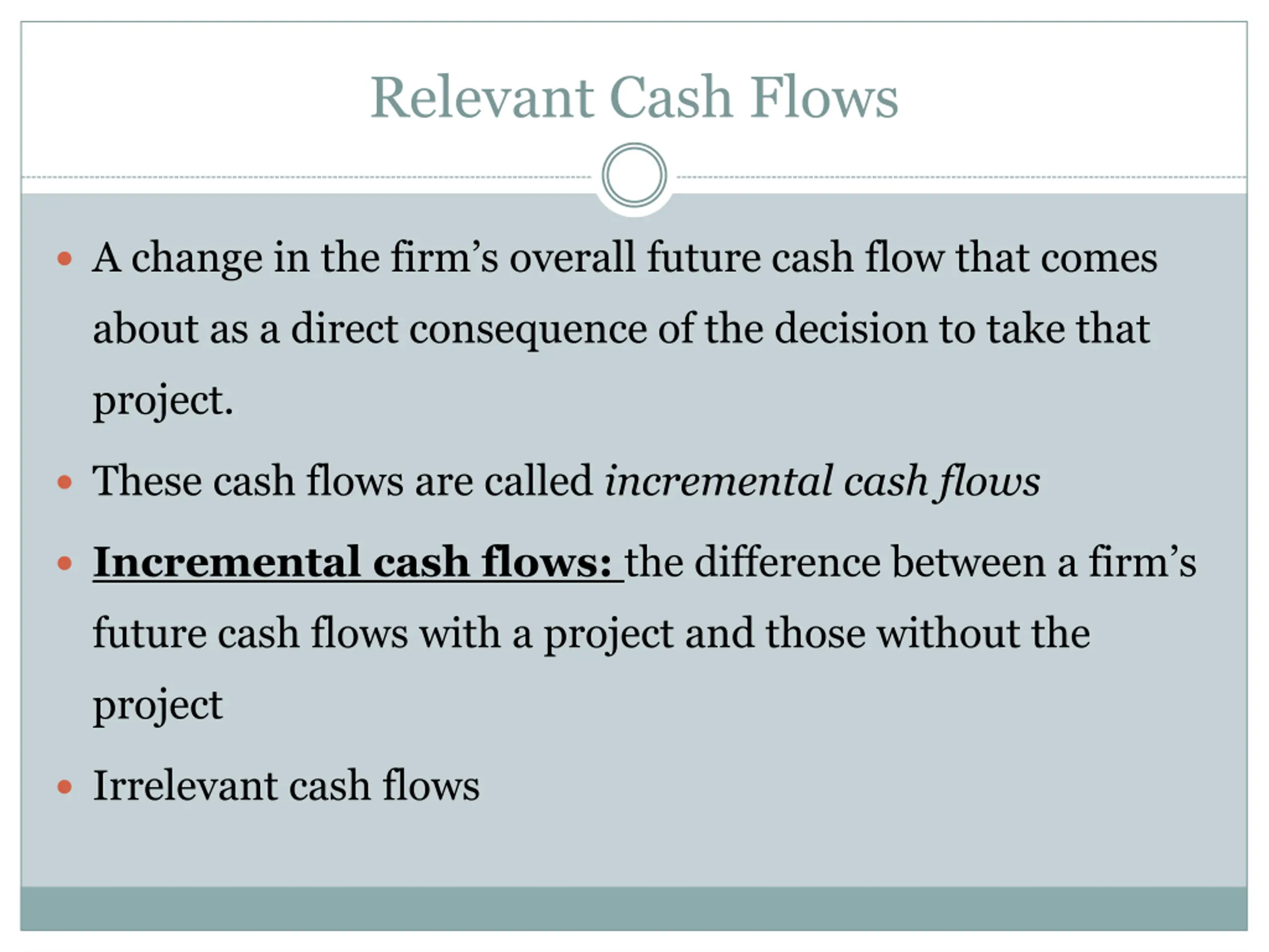 Relevant Cash Flows A change in the firm s overall future cash flow that comes about as a direct consequence of the decision to take that project. These cash flows are called incremental cash flows Incremental cash flows: the difference between a firm s future cash flows with a project and those without the project Irrelevant cash flows