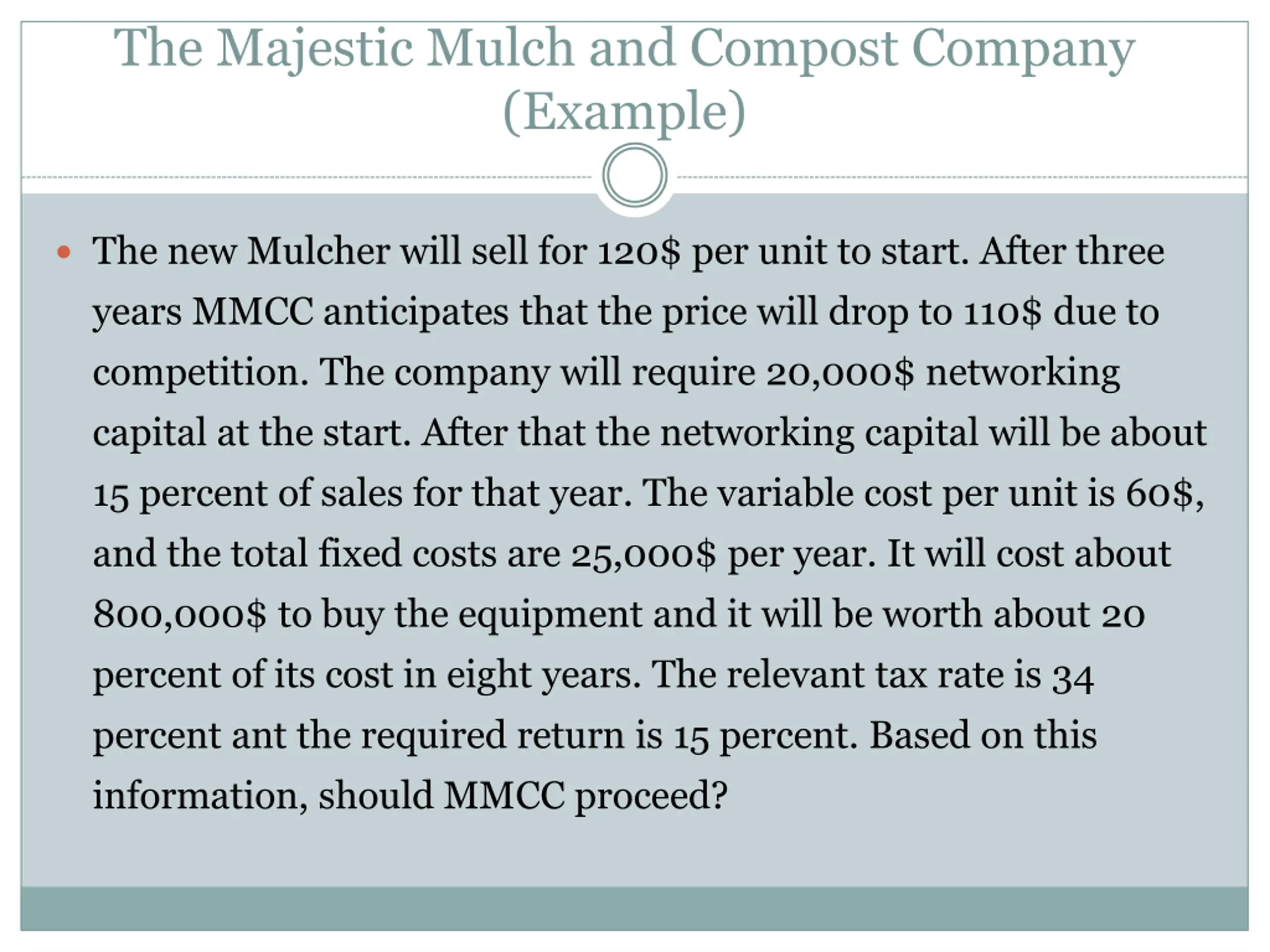 The Majestic Mulch and Compost Company (Example) The new Mulcher will sell for 120$ per unit to start. After three years MMCC anticipates that the price will drop to 110$ due to competition. The company will require 20,000$ networking capital at the start. After that the networking capital will be about 15 percent of sales for that year. The variable cost per unit is 60$, and the total fixed costs are 25,000$ per year. It will cost about 800,000$ to buy the equipment and it will be worth about 20 percent of its cost in eight years. The relevant tax rate is 34 percent ant the required return is 15 percent. Based on this information, should MMCC proceed?