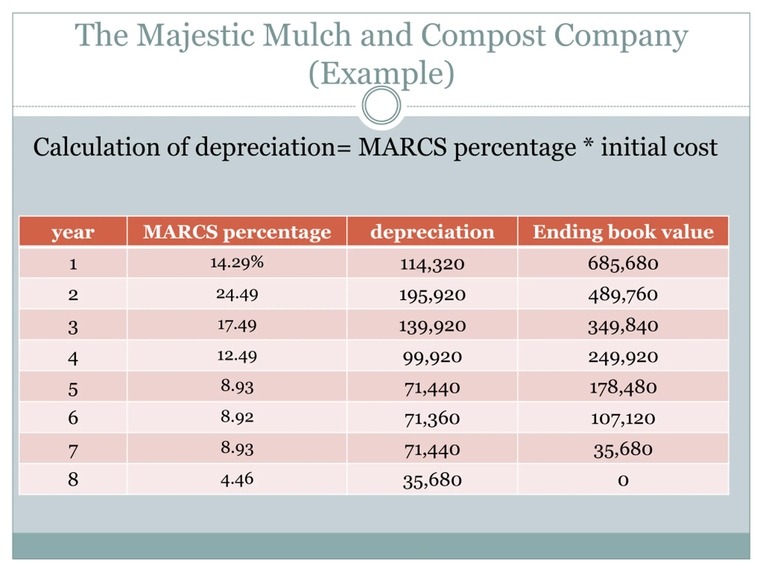 The Majestic Mulch and Compost Company (Example) Calculation of depreciation= MARCS percentage * initial cost year 1 2 3 4 5 6 7 8 MARCS percentage depreciation 114,320 195,920 139,920 99,920 71,440 71,360 71,440 35,680 Ending book value 685,680 489,760 349,840 249,920 178,480 107,120 35,680 0 14.29% 24.49 17.49 12.49 8.93 8.92 8.93 4.46