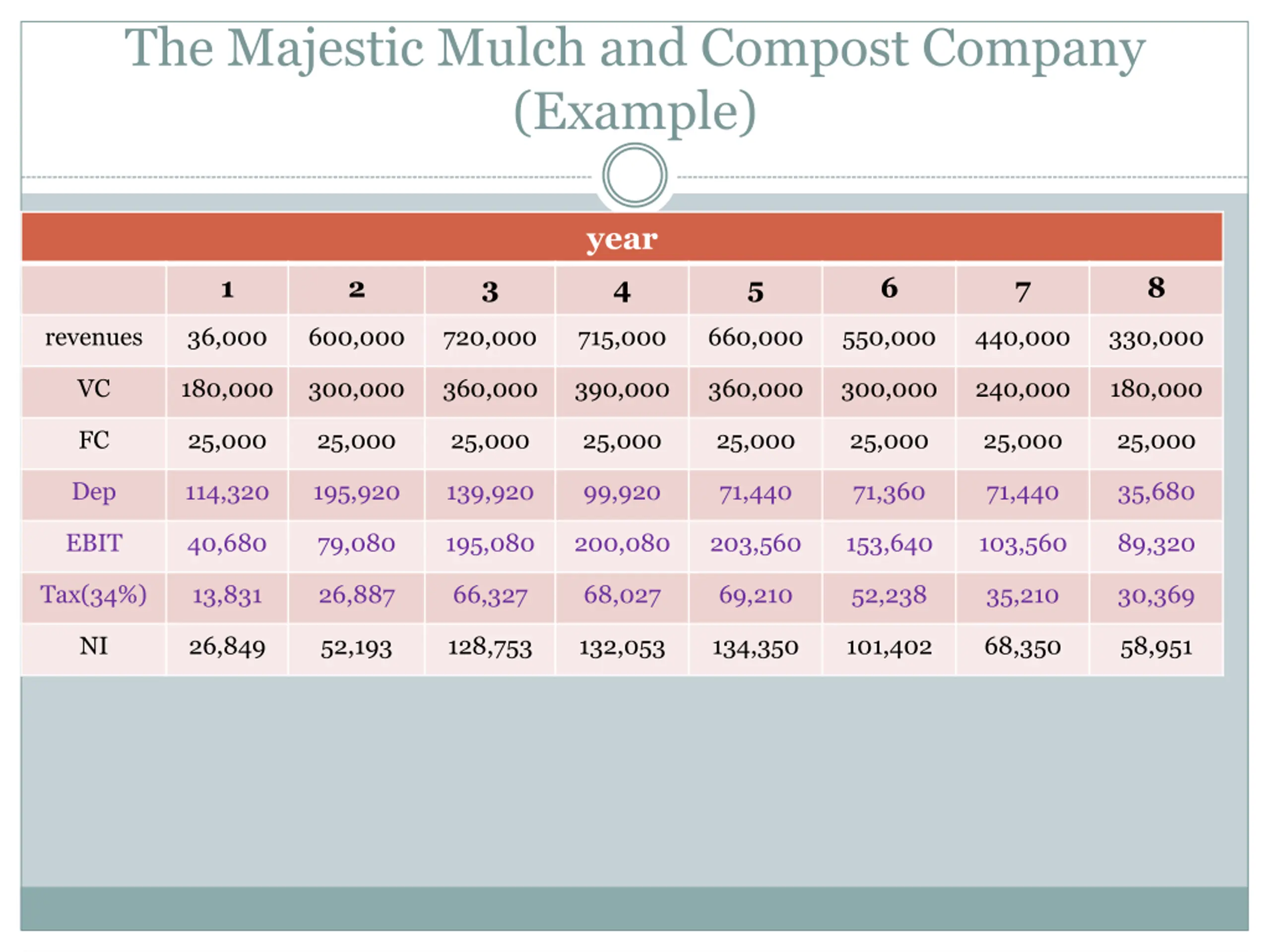 The Majestic Mulch and Compost Company (Example) year 1 2 3 4 5 6 7 8 revenues 36,000 600,000 720,000 715,000 660,000 550,000 440,000 330,000 VC 180,000 300,000 360,000 390,000 360,000 300,000 240,000 180,000 FC 25,000 25,000 25,000 25,000 25,000 25,000 25,000 25,000 Dep 114,320 195,920 139,920 99,920 71,440 71,360 71,440 35,680 EBIT 40,680 79,080 195,080 200,080 203,560 153,640 103,560 89,320 Tax(34%) 13,831 26,887 66,327 68,027 69,210 52,238 35,210 30,369 NI 26,849 52,193 128,753 132,053 134,350 101,402 68,350 58,951