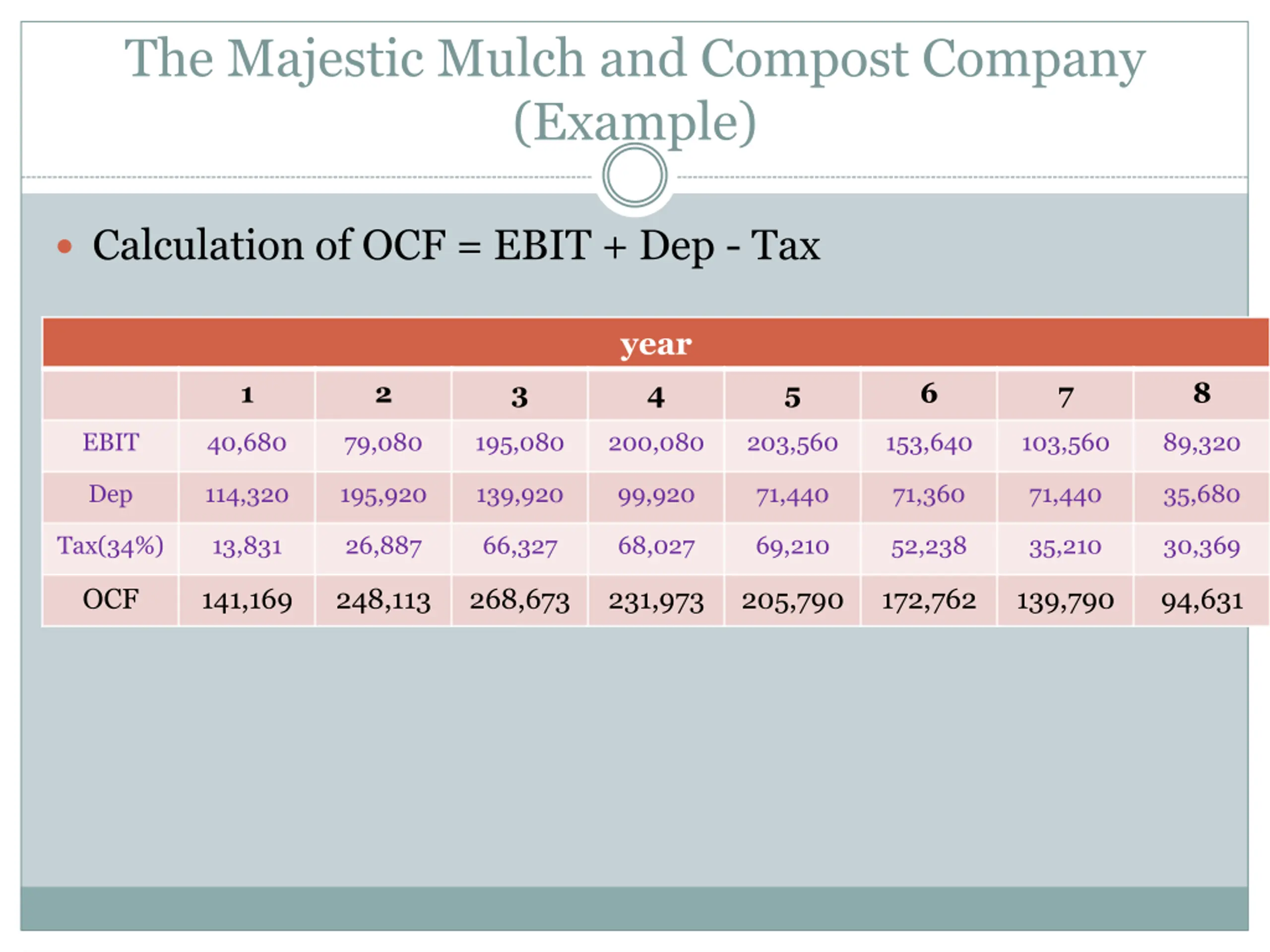 The Majestic Mulch and Compost Company (Example) Calculation of OCF = EBIT + Dep - Tax year 1 2 3 4 5 6 7 8 EBIT 40,680 79,080 195,080 200,080 203,560 153,640 103,560 89,320 Dep 114,320 195,920 139,920 99,920 71,440 71,360 71,440 35,680 Tax(34%) 13,831 26,887 66,327 68,027 69,210 52,238 35,210 30,369 OCF 141,169 248,113 268,673 231,973 205,790 172,762 139,790 94,631