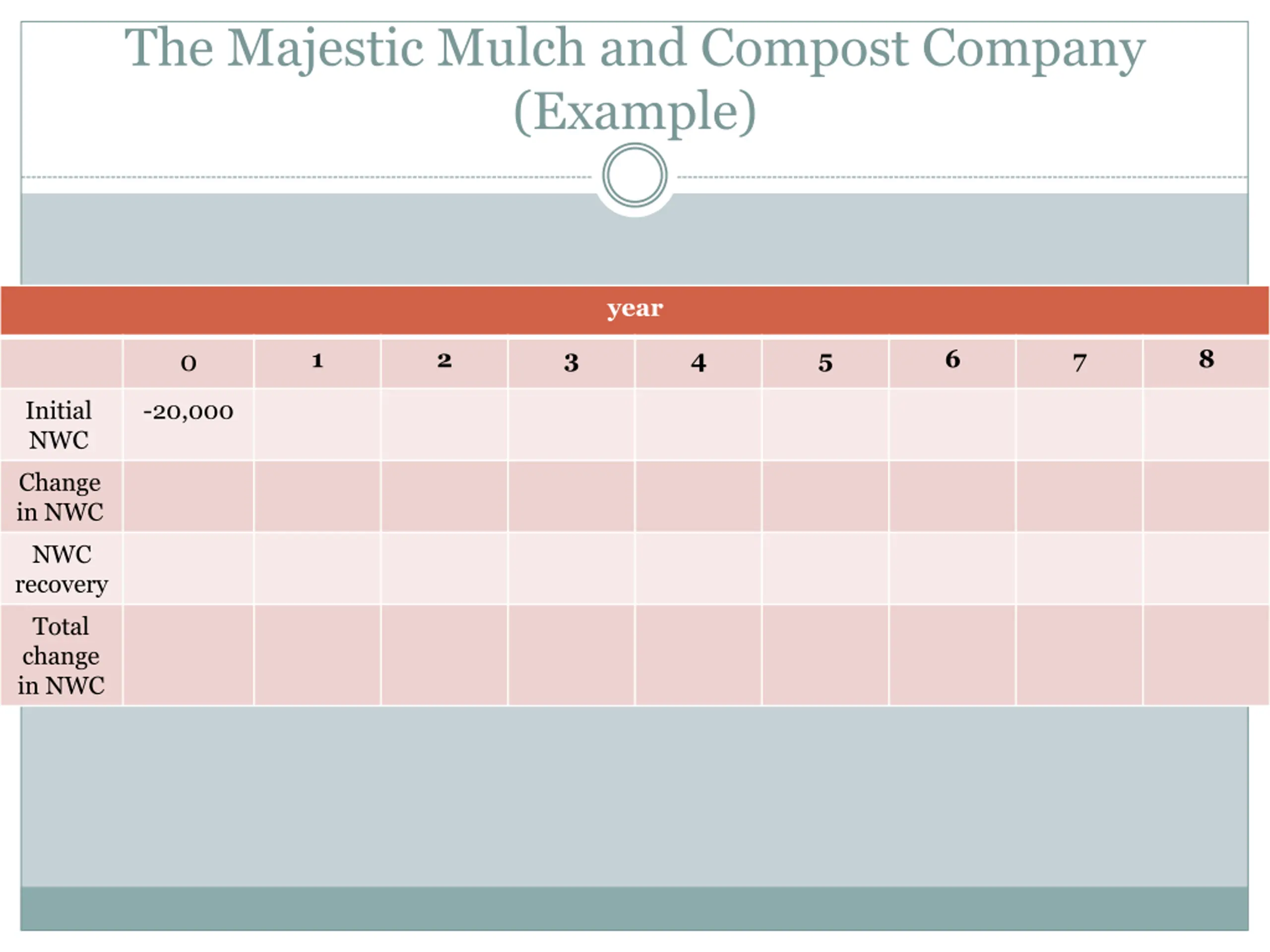 The Majestic Mulch and Compost Company (Example) year 1 2 3 4 5 6 7 8 0 Initial NWC -20,000 Change in NWC NWC recovery Total change in NWC