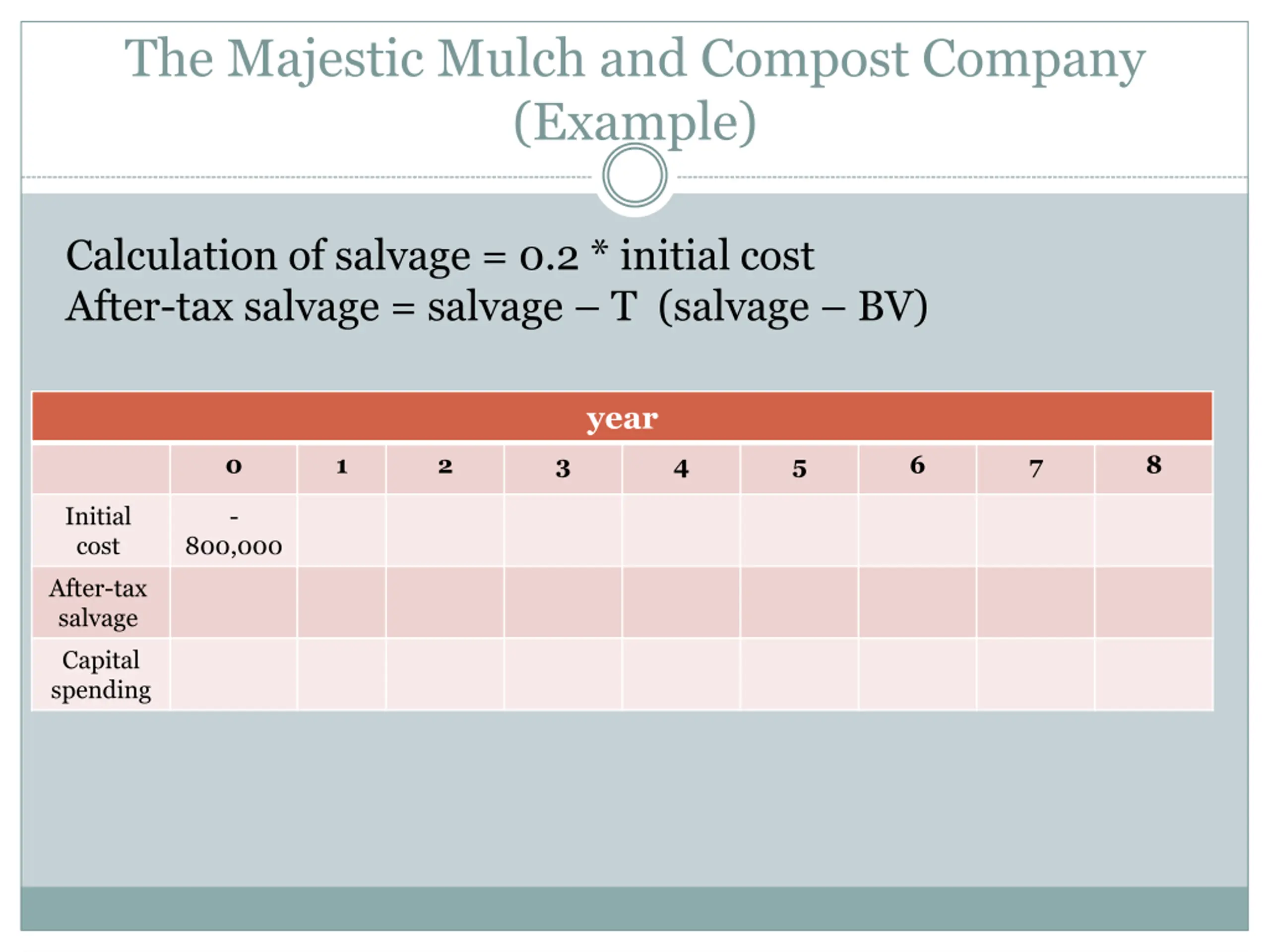 The Majestic Mulch and Compost Company (Example) Calculation of salvage = 0.2 * initial cost After-tax salvage = salvage T (salvage BV) year 0 1 2 3 4 5 6 7 8 Initial cost - 800,000 After-tax salvage Capital spending