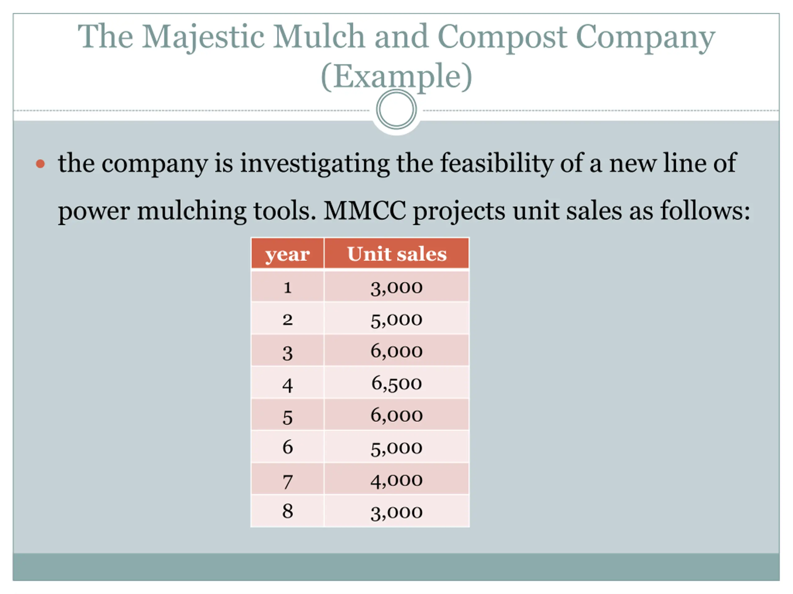 The Majestic Mulch and Compost Company (Example) the company is investigating the feasibility of a new line of power mulching tools. MMCC projects unit sales as follows: year 1 2 3 4 5 6 7 8 Unit sales 3,000 5,000 6,000 6,500 6,000 5,000 4,000 3,000
