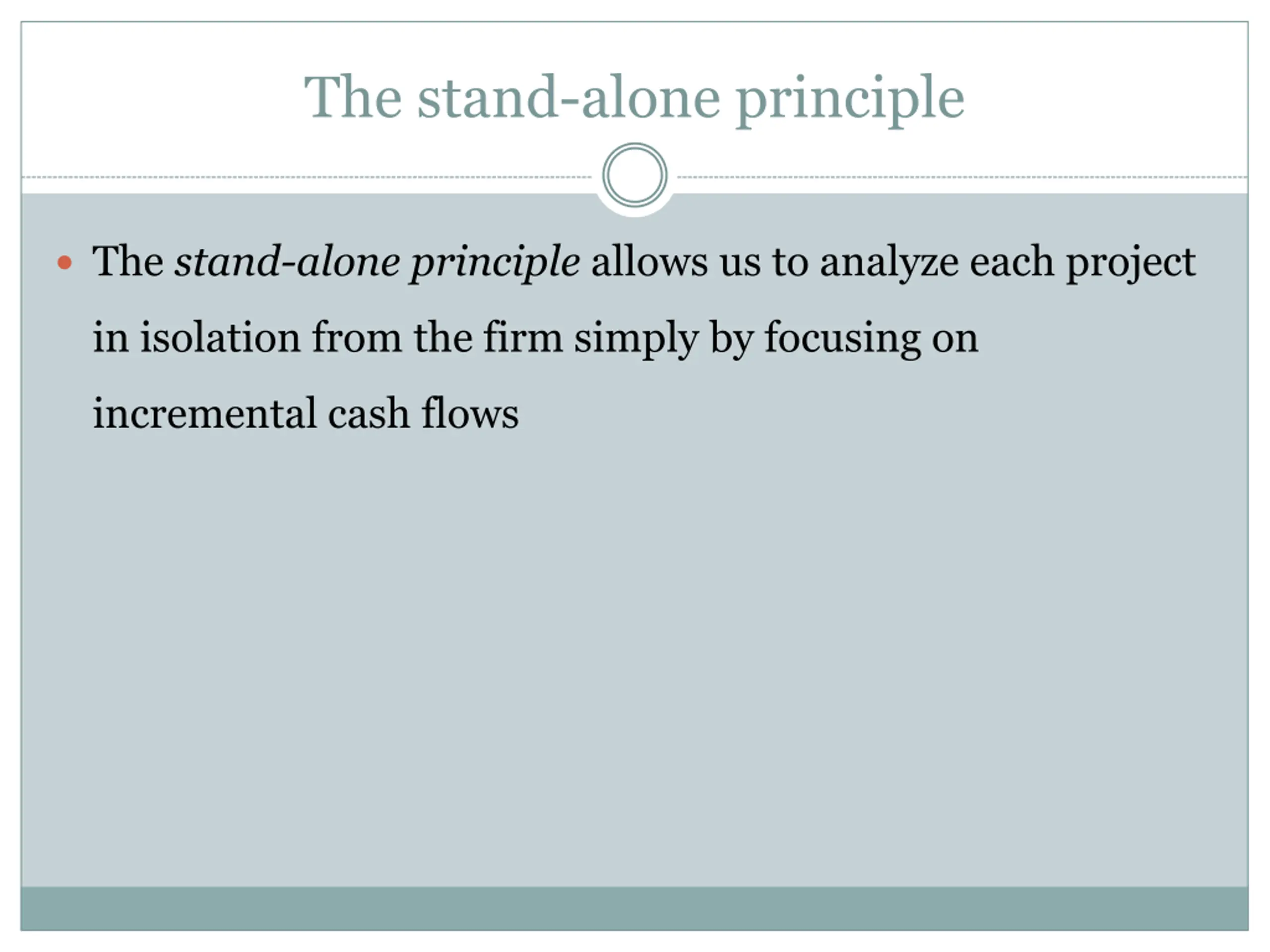 The stand-alone principle The stand-alone principle allows us to analyze each project in isolation from the firm simply by focusing on incremental cash flows