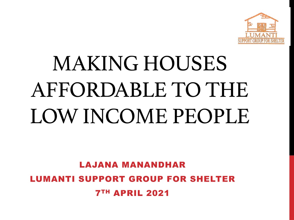 MAKING HOUSES AFFORDABLE TO THE LOW INCOME PEOPLE LAJANA MANANDHAR LUMANTI SUPPORT GROUP FOR SHELTER 7THAPRIL 2021