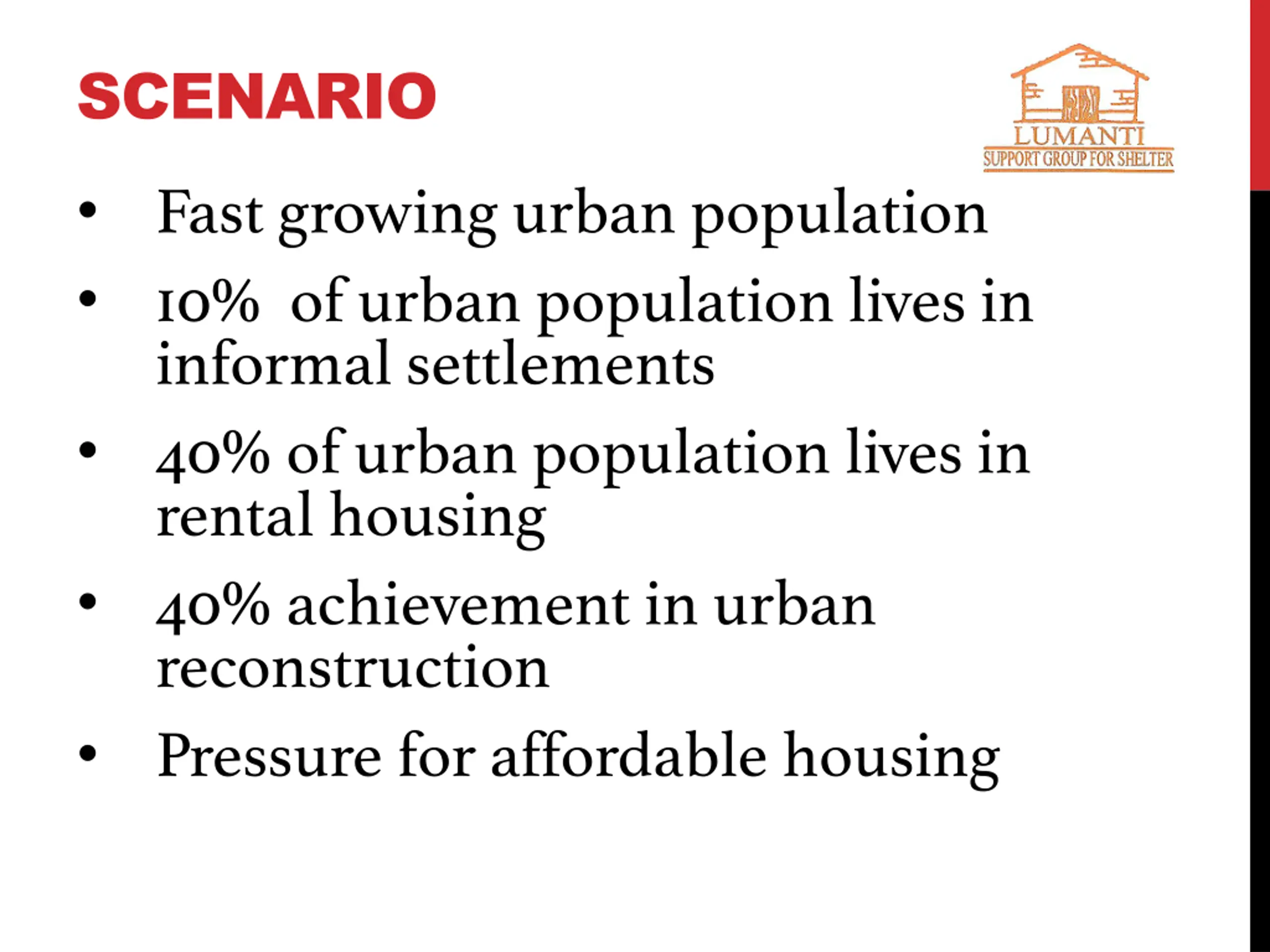 SCENARIO Fast growing urban population 10% of urban population lives in informal settlements 40% of urban population lives in rental housing 40% achievement in urban reconstruction Pressure for affordable housing