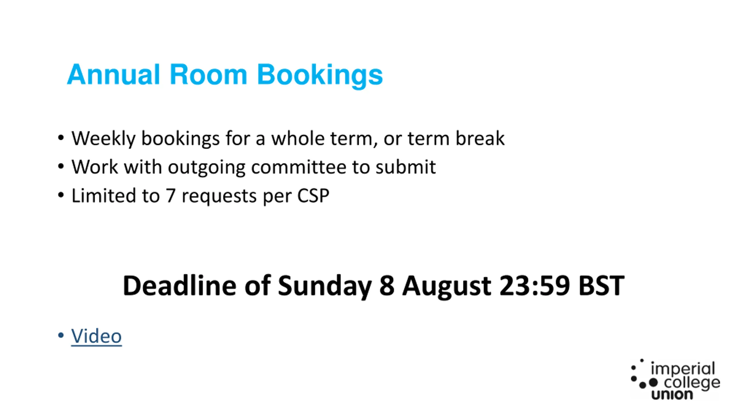 Annual Room Bookings Weekly bookings for a whole term, or term break Work with outgoing committee to submit Limited to 7 requests per CSP Deadline of Sunday 8 August 23:59 BST Video