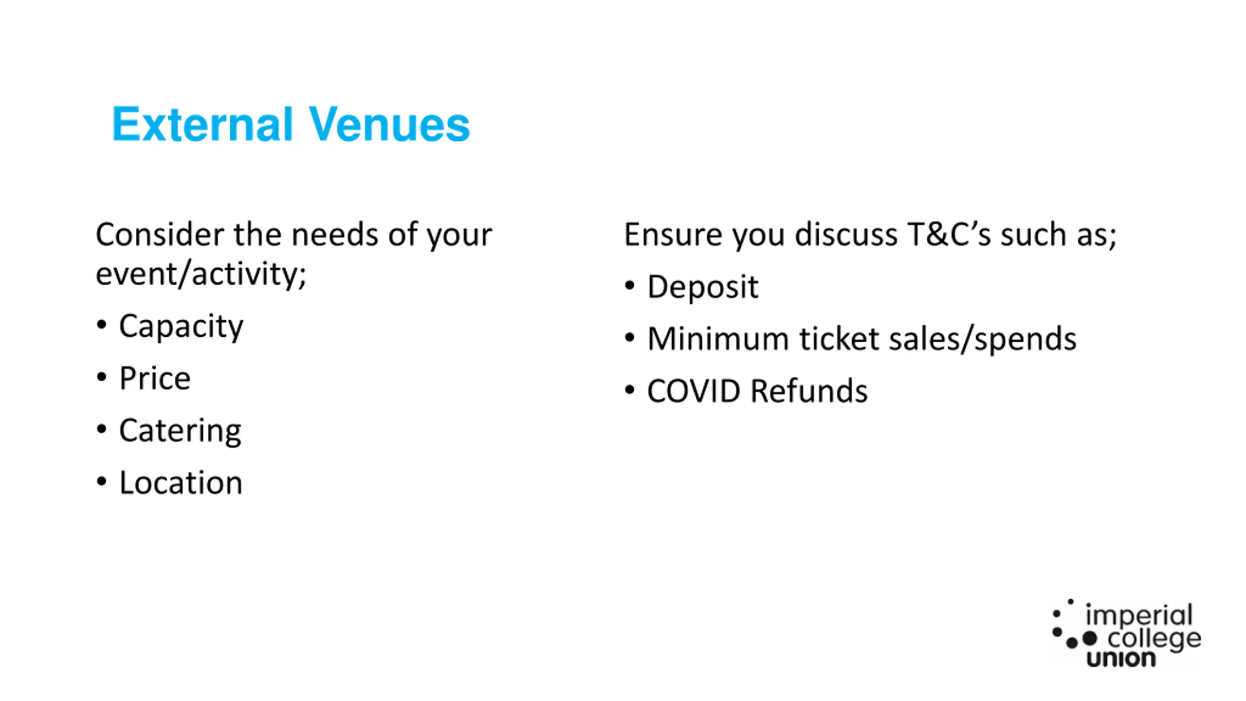 External Venues Consider the needs of your event/activity; Capacity Price Catering Location Ensure you discuss T&C s such as; Deposit Minimum ticket sales/spends COVID Refunds