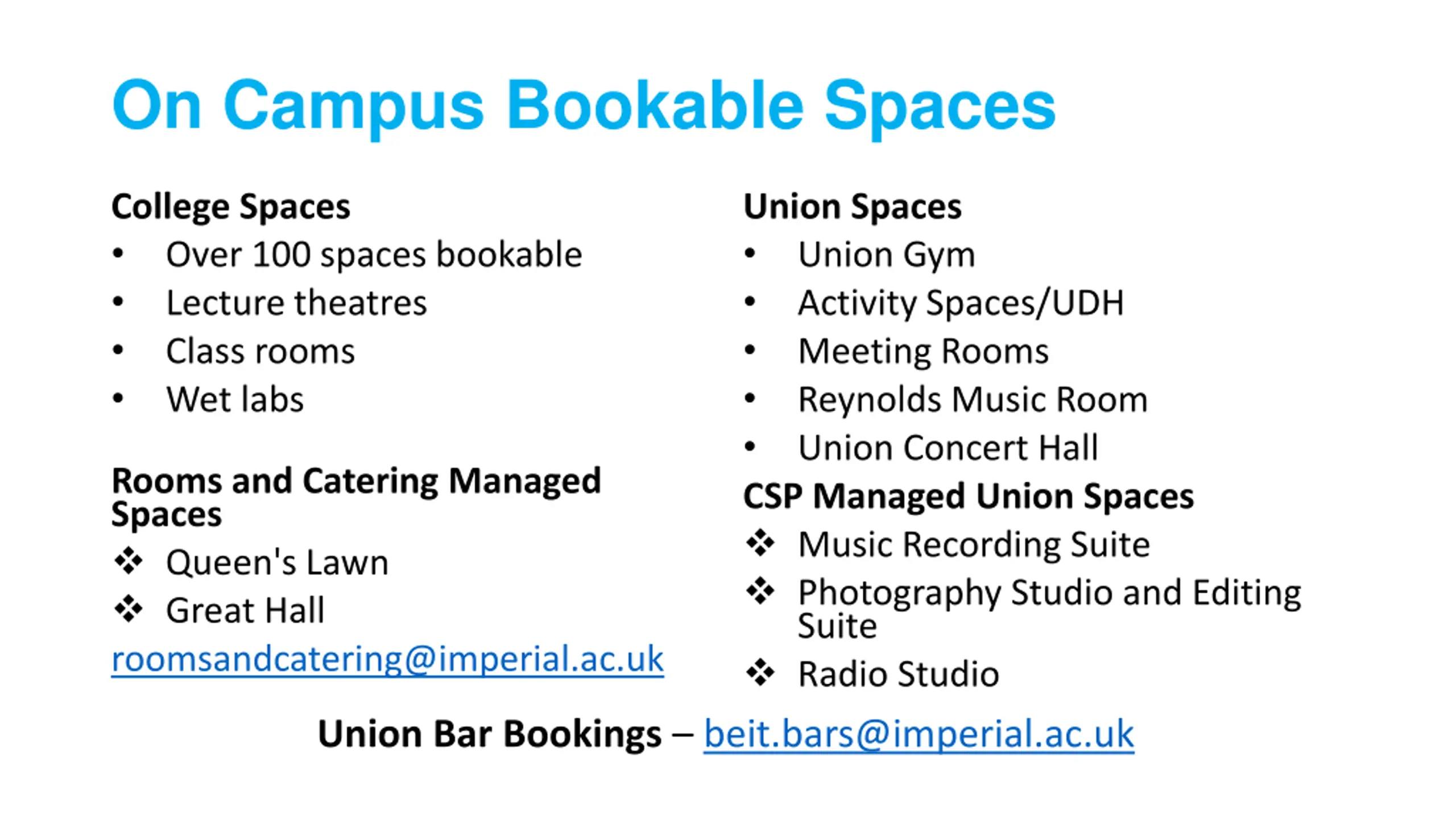 On Campus Bookable Spaces College Spaces Over 100 spaces bookable Lecture theatres Class rooms Wet labs Union Spaces Union Gym Activity Spaces/UDH Meeting Rooms Reynolds Music Room Union Concert Hall CSP Managed Union Spaces Music Recording Suite Photography Studio and Editing Suite Radio Studio Rooms and Catering Managed Spaces Queen's Lawn Great Hall roomsandcatering@imperial.ac.uk Union Bar Bookings beit.bars@imperial.ac.uk