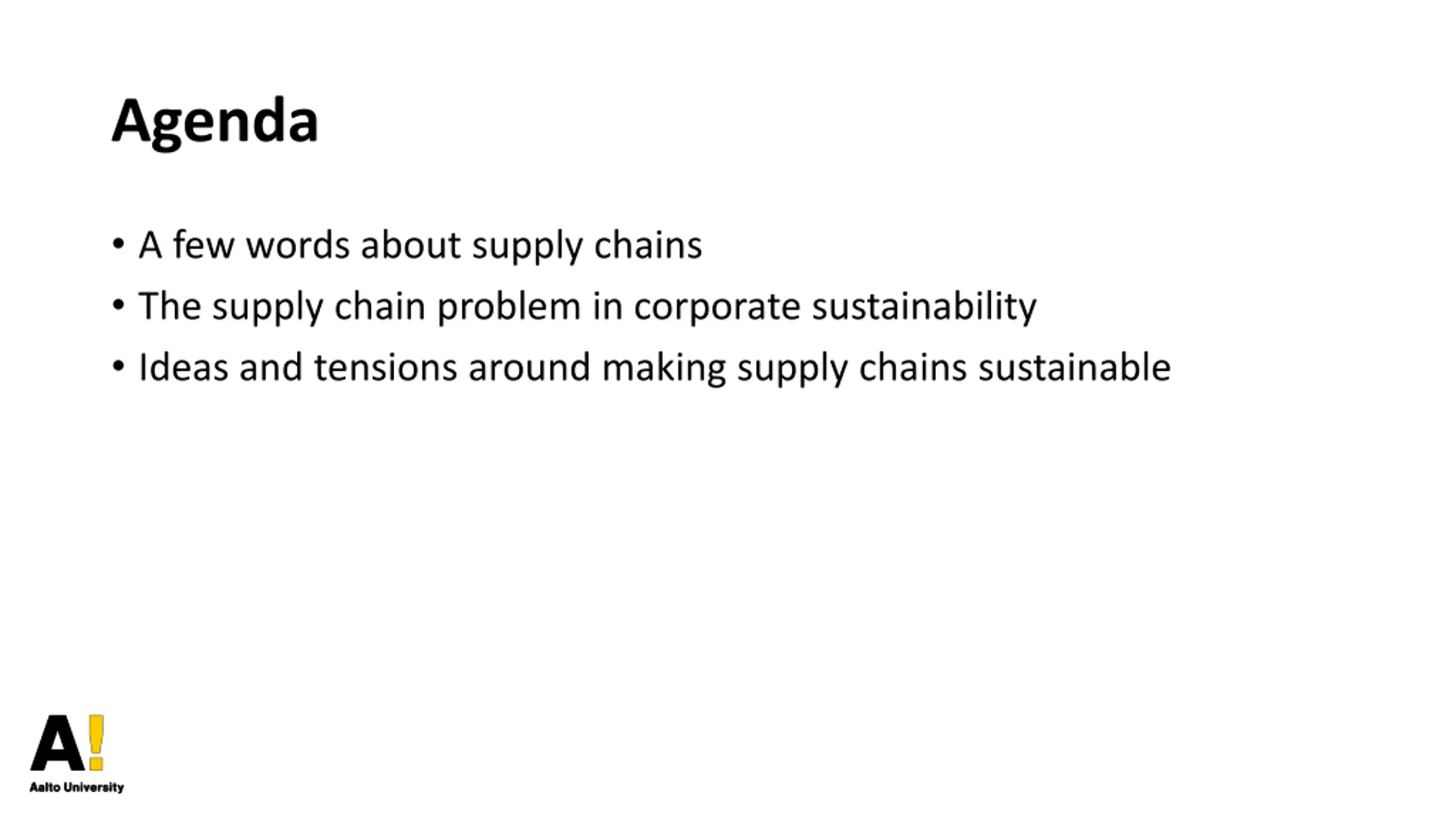 Agenda A few words about supply chains The supply chain problem in corporate sustainability Ideas and tensions around making supply chains sustainable